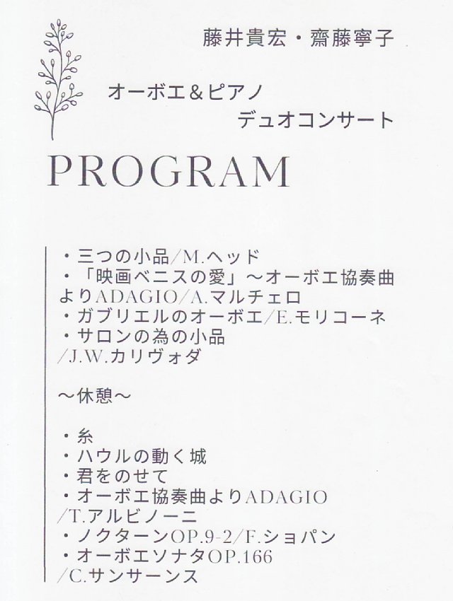 開催日:2025.4.29(火) 14:00開演場所 :レストランベル藤井貴宏・齋藤寧子 オーボエ&ピアノ デュオコンサートに行ってきました。プログラム前半1.三つの小品/M.ヘッド2.「映画ベニスの愛」~オーボエ協奏曲よりADAGIO/A.マルチェロ3.ガブリエルのオーボエ/E.モリコーネ4.サロンの為の小品/J.W.カリヴォダ後半5.糸6.ハウルの動く城7.君をのせて8.オーボエ協奏曲よりADAGIO/T.アルビノーニ9.ノクターンOp.9-2/F.ショパン10.オーボエソナタOp.166/サンサーンスアンコール11.愛の夢 第3番/F.リストレポート三つの小品オープニングは、オーボエとピアノのために書かれたGavotte・Elegiac Dance・Prestoの3曲からなる楽曲で12分ちょっとの尺があり、なかなかの聴き応えがありました。このあたり、昨今のコンサートのトレンドとも言える傾向で、最初に長めの曲を演奏し、まずはオーボエとピアノという編成のサウンドをじっくり感じもらおうという狙いが感じられました。「映画ベニスの愛」~オーボエ協奏曲よりADAGIOフィギュアスケートのBGMでも使われた楽曲で、バロックの香りがするとてもステキな音楽と感じました。お話では、この曲を使ってバッハが勉強をしたとのことで、もともとのメロディーを繰り返すごとに装飾を加えて変化させてゆくという演奏スタイルも興味深く聴かせていただきました。ガブリエルのオーボエこのところ藤井氏のコンサートでは、必ず演奏され、18番的な楽曲という印象がありますが、言葉が通じない相手に音楽の力で説得する…というお話がありました。また演奏に先立ってキリスト教にまつわる音楽文化の発展についてもお話があり、ここでも教えを歌にしたものがコラールであり、教会の音の残響の長さから音を重ねるとハーモニーが生まれるという発見があったとのことで、いわば音楽の起源と爆発的な発展の起点を感じたひとときになりました。サロンの為の小品わりと古めの楽曲との紹介でしたが、先ほどの音楽の起源の話に絡めて、発展期の音楽が社交場としてのサロンを通じて幅広い人たちに親しまれていったという状況が感じ取れるところでした。楽曲は10分程度の曲ですが、メロディアスだったり、かなりのテクニカルもあってオーボエの魅力を存分に感じたひとときになりました。糸後半最初の曲は、中島みゆきの代表曲の1つとして知られる糸でしたが、藤井氏がその中島みゆきに実際に会った時のお話もあり、その実像はどんなものだったか…ということを演奏された曲とともに身近に感じることができました。ハウルの動く城~君をのせて久石譲氏の有名曲を2曲続けての演奏となりました。そしてこの久石氏は中野市出身であり、じつは藤井氏の小・中・高の大先輩であるということで、そんな縁もあってか、これまでの藤井氏のコンサートで何度か取り上げられていましたが、久石氏の音楽は何といってもメロディーが良いとのことで、それは世界でも認められるところで、その演奏会はプレミアチケットで500ドルにもなるということでした。オーボエ協奏曲よりADAGIO演奏に先立って、ADAGIOについてお話があり、そもそも音楽記号で似たものにLentoやLargoがあるけれど、それとどう違うのか?ということで、藤井氏がヨーロッパの教会で演奏する曲はほぼADAGIOであることから、神に向かい、神に捧げる音楽で温かみを持ったという意味ではないか?ということでした。そんなことを念頭におきつつ曲を聴くと、とても暖かい気持ちになった感がありました。ノクターンOp.9-2こちらの楽曲はピアニストの斎藤氏のソロとなりました。演奏に先立って、今まさに行われているショパン・コンクールへ話が及び、前回2021年のショパンコンクールでは日本人2人の入賞という快挙があったこと。演奏する時に奏者がピアノを選べること。楽器メーカーは、奏者に選んでもらうためにやっきになっていること。限られた調律の時間でいかにベストな状態にする裏方の腐心など、コンクールならではの裏事情も知ることができました。オーボエソナタOp.166藤井氏の18番という印象で、過去には2021年8月の蓼科園地・野外音楽堂内ホールでのサロンコンサートにて1回目。2022年8月の飯山市文化交流館なちゅら 小ホールでの原田愛氏とのデュオコンサートで2回目。その後3年の間が空きましたが、今回3回目の拝聴となったことから「あれ…聴いたことがある。」ということで、一度聴いた音楽は断片的にせよ記憶の深層に残っているものなのだな…と感じたひとときになりました。愛の夢 第3番アンコール曲として、ピアニストの齋藤氏が大好きな曲であるリストの有名曲の演奏となりました。齋藤氏によれば、この曲はピアノソロでの楽譜ではあるが歌のパートもあって、それを藤井氏の演奏が担当する形での演奏となりました。まとめ今回、2023年4月の開催以来のレストランベルでのコンサートとなりましたが、このレストランがピアニストの齋藤氏の実家ということと、斎藤氏は藤井氏が姉さんと慕う間柄であること。そして
