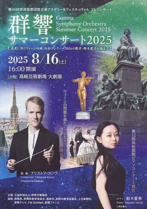 開催日:2025.8.16(土)16:00開演場所 :高崎芸術劇場 大劇場(2,027名収容)群響サマーコンサート2025に行ってきました。プログラム前半1.J.シュトラウスII/喜歌劇《こうもり》序曲 作品362 約9分2.ベートーヴェン/ピアノ協奏曲 第3番 ハ短調 作品37 約37分 ピアノソロ:鈴木愛美 第1楽章 アレグロ・コン・ブリオ 第2楽章 ラルゴ 第3楽章 ロンド:アレグロ ソリストアンコール シューベルト/6つの楽興の時 Op.94,D.780 第3番後半3.J.シュトラウスII/ワルツ「レモンの花咲くところ」作品364 約9分4.J.シュトラウスII/新ピッツィカートポルカ 作品449 約32分5.J.シュトラウスII/ポルカ「浮気心」 作品319 約3分6.J.シュトラウスII/皇帝円舞曲 作品437 約11分7.J.シュトラウスII/ポルカ「雷鳴と稲妻」 作品324 約3分8.J.シュトラウスII/ワルツ「美しく青きドナウ」 作品314 約13分アンコール9.J.シュトラウスII/トリッチ・トラッチ・ポルカレポート喜歌劇《こうもり》序曲 作品362ヨハン・シュトラウス二世生誕200周年となる2025年は、私自身も年初からその楽曲にふれる機会がより多くなっていますが、特にこうもり序曲は、聴くだけでなく演奏者としても触れてきていることから、より親しみを感じながら聴かせていただきました。そして今回は何と言ってもフルオーケストラによる演奏であり、オーストリア出身のクリストフ・コンツ氏による指揮であるということも、より本場感を間近で感じられる贅沢なひとときを堪能させていただきました。ピアノ協奏曲 第3番 ハ短調 作品372024年11月、3年に一度開催される浜松国際ピアノコンクールで日本人初となる第1位を受賞した23歳の新進気鋭の鈴木愛美氏を迎えての演奏ということで、その注目度は大変大きなものがありました。そして今回、あえてピアノの生音を間近で聴くために音響が良いとされるS席ではなくA席扱いとなる最前列にて演奏を聴かせていただいたところ、ピアノの演奏が思っていた以上に大きくクローズアップされ、オーケストラはだいぶ遠くで聞こえている感じになって、ピアノに全振りとも言えるバランスでの演奏を聴くことができ、これは生演奏ならではの醍醐味の1つとして大いにありなのではないか?と感じるところがありました。また間近ゆえに、演奏する鈴木氏の表情や腕の動きなどをとてもリアルに捉えることができたのも、フルオーケストラの協奏曲でありながら、サロンで演奏を聴くような感覚もあってとても新鮮でした。6つの楽興の時 Op.94,D.780 第3番ソリストアンコールは、シューベルトの有名な楽曲ですが、こちらは3月に行われた高橋多佳子氏のリサイタルでも聴いたところだったので、より親しみを持って聴かせていただきました。ワルツ「レモンの花咲くところ」作品364後半は、オールシュトラウス2世プログラムということで、その皮切りとなるのは南国風のこちらの楽曲。この曲は、シュトラウスがイタリアからの招待を受けて旅立った先でインスピレーションを得て書かれた曲なのかなと想像するところですが、私自身も過去にこの曲を演奏したことがあったので、その当時のことを懐かしく想い出しつつ聴かせていただきました。新ピッツィカートポルカ 作品449弦楽器で弓を使わず、指で弾くだけのピッチカートで演奏されるのが特徴的な曲ですが、弓を使わないゆえに、弦楽器特有の動きがなく、なにやら新鮮な演奏風景となりました。また音楽的にも音量が小さくて音と音の隙間ができるため、とても可愛らしい印象がありました。ポルカ「浮気心」 作品319疾走感のあるポルカ・シュネルで、曲目解説には跳躍や前打音の多い、飛び跳ねるような曲調と紹介されており、まさしくその通り!というところです。皇帝円舞曲 作品437『美しく青きドナウ』と『ウィーンの森の物語』とともに「三大ワルツ」の一角を占める人気曲ですが、やはりフルオーケストラで聴くと、その堂々たる曲調がよりクローズアップされてじつに見事と感じ、音楽的誉め言葉とすればブラボーと心の中で叫ばずにいられないところでした。ポルカ「雷鳴と稲妻」 作品324運動会でおなじみのナンバーと曲紹介にありましたが、まさしくその通りだなというところです。とはいえやはりフルオーケストラで聴くのは格別で、大太鼓とシンバルの雷鳴と稲妻の迫力を体で感じることができました。ワルツ「美しく青きドナウ」 作品314オーストリアの第2の国歌として知られるシュトラウス二世の代表曲ですが、私自身もつい2カ月ほど前に演奏する機会があり、やはりこの曲の素晴らしさは別格だな…という想いを改めて感じたところでしたが、フルオーケストラで聴くのは2023年1月のウィーン・フォルクスオーパー交響楽団とNHK交響楽団のニューイヤーコンサート以来であり、しかも正月以外でこの曲を聴くのは記憶の中では初めてかもしれず、とても新鮮な感覚がありました。トリッチ・トラッチ・ポルカアンコールはおなじみの曲でしたが、こちらも雷鳴と稲妻とならぶ運動会曲…。それにしても運動会