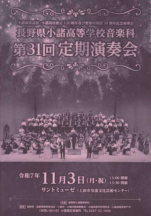 開催日:2025.7.6(日) 9:45開演場所 :上田高校 同窓会館2F第68回松尾祭 上田高校室内楽班 Classic concertに行ってきました。プログラム1.弦楽セレナーデより第1楽章 -ドヴォルザーク2.管弦楽組曲第3番よりアリア -バッハ3.It's a small world4.「ホルベアの時代から」より前奏曲 -グリーグ5.サマーウォーズより「栄の活躍」6.生まれてはじめて7.プリンク・プレンク・プランク -アンダーソン8.セントポール組曲より第4楽章 -ホルストアンコール9.白雪姫より いつか王子様がレポート弦楽セレナーデより第1楽章曲目紹介によれば、カノンの形式が採用されており、曲全体を通してパート同士が会話をしているかのような雰囲気が感じられるとあり、そんな対話の雰囲気を感じつつ、まずはオープニング曲として弦楽合奏らしいやさしいサウンド感に浸らせていただきました。管弦楽組曲第3番よりアリアG線上のアリアで知られるバッハの有名曲の1つですが、3年生引退後の2年生中心のパート割りでの演奏となりました。前列で演奏する2年生を後方から3年生が支える形となり、温かみのある曲調もあいまって、学年間の絆を感じさせるひとときになりました。It's a small world1年生8人よる演奏となりました。演奏に先立って3歳から弦楽器を習っているという班員の方にインタビューがあり、弦楽器の大変なところとして指が痛くなるというお話がありました。そういえば先週の辻彩奈氏のコンサートでも最後の方で「もう少し私の指にがんばってもらって…。」というコメントがあったことを想い出し、弦を抑える指の力は相当に強いのだろうということがわかりました。「ホルベアの時代から」より前奏曲3年生による最後の学年演奏となりましたが、息の合った演奏とまとまり感がとてもステキなハーモニーとなっており、流石の演奏と感じました。またこちらの楽曲は3月の第27回定期演奏会のオープニング曲で演奏されたこともあり、集大成感もありました。サマーウォーズより「栄の活躍」~生まれてはじめて2曲続けての演奏となりましたが、サマーウォーズは細田守監督の奥さんの出身地が上田だったことからインスピレーションを受けて生まれたとの紹介がありました。また映画中に上田高校の校門が出てくることもあり、今日の演奏会場である同窓会館2Fからはその校門が見えることもあって、なんとも贅沢なシチュエーションのもと縁を感じつつ楽しませていただきました。生まれてはじめてはアナ雪の代表曲の1つですが、神田沙也加さんが歌った曲としての印象が強いですが、題名もそうですが曲調的にもこれからの曲というイメージがありました。プリンク・プレンク・プランクここからは3学年全員での演奏となりました。アンダーソンらしい遊び後心にあふれた楽曲で、特徴としてはオールピッチカートで弓を使わないため、独特なサウンド感がありました。また指揮をされた先生が、足元にスライドホイッスル、ヴィヴラスラップなどを置いて演奏に加わったり、曲の最後にかけ声!といった演出もあり、そういえば最近演奏したアンダーソンのワルツィングキャットでも最後にワンワンワンがあったっけな…と想い出し、改めてアンダーソンの曲の魅力を感じた次第です。セントポール組曲より第4楽章曲紹介にもありましたが、こちらの楽曲はホルストの吹奏楽のための第2組曲の中の1曲を弦楽合奏版に編曲したもので、私も1度だけ第2組曲を演奏したことがあり、聴いとたん「これ演奏したことある!」ということで、とても懐かしく演奏を楽しませていただきました。白雪姫より いつか王子様がアンコール曲は、ディズニーミュージックではおなじみの楽曲ですが、やっぱりこの曲は弦楽器のサウンドがしっくりくるなと感じながら映画のエンドロールを見ているかのような雰囲気で楽しませていただきました。まとめ室内楽班の定期演奏会は、開催時期が3~4月ということもあり、ニ・三年生によるステージとなることから、一年生も加えた三学年が一同に会してコンサートを行う最後の機会が、松尾祭での公演ということで、全学年揃い踏みのとても貴重な機会と感じました。また班員は三年生10名、二年生8名、一年生8名とのことですが、顧問の先生もヴィオラで合奏に参加するなど、一緒になって楽しむ様子がとても素晴らしいと感じました。