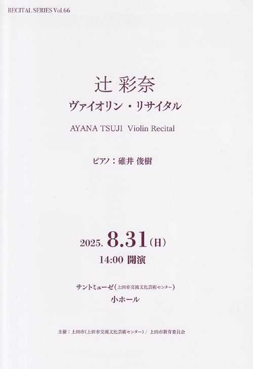 開催日:2025.8.31(日) 14:00開演場所 :上田市交流文化芸術センター サントミューゼ小ホール(320名収容)辻彩奈ヴァイオリン・リサイタルに行ってきました。プログラム前半1.J.S.バッハ:無伴奏ヴァイオリンのためのパルティータ 第1番 ロ短調 BWV1002 第1楽章:アルマンド/ドゥーブル 第2楽章:クーラント/ドゥーブル 第3楽章:サラバンド/ドゥーブル 第4楽章:テンポ・ディ・ブーレー/ドゥーブル2.J.S.バッハ:ヴァイオリン・ソナタ 第4番 ハ短調 BWV1017 第1楽章:ラルゴ 第2楽章:アレグロ 第3楽章:アダージョ 第4楽章:アレグロ後半3.イザイ:悲劇的な詩 op.124.サン=サーンス:ヴァイオリン・ソナタ 第1番 ニ短調 op.75 第1楽章 第1部:アレグロ・アジタート 第2部:アダージョ 第2楽章 第1部:アレグレット・モデラート 第2部:アレグロ・モルトアンコール5.パラディス:シチリアーノレポート無伴奏ヴァイオリンのためのパルティータ 第1番プログラムノートによれば、バッハの無伴奏ヴァイオリンのためのパルティータは、第1番から第6番まであり、ヴァイオリンのバイブル的存在ということで、思い返せば、2022年9月の第581回 群響定期演奏会プログラム 上田定期演奏会で辻氏がソリストとしてサン=サーンスのヴァイオリン協奏曲を演奏した後のソリストアンコールで第3番の第3楽章を演奏したことが、強く印象に残っている訳ですが、今日は第1番の全楽章の演奏ということで、尺的には前半プログラムの半分以上となる約30分というボリューム感で、演奏後の辻氏のコメントでも、そのことに触れられており、これだけたっぷり演奏を聴いていただいて今更みなさんこんにちは!でもないですけれど…。と恐縮するほどの大プログラムに圧倒された次第です。ヴァイオリン・ソナタ 第4番プログラムノートによれば、無伴奏ヴァイオリンのためのパルティータと好一対をなすのが、チェンバロとの6つのソナタとのことで、今回はチェンバロをピアノに替えての演奏となりましたが、バロックの響きをじっくりと楽しませていただきました。プログラム的には、バッハの2曲で前半をまとめるという形になりましたが、このあたり辻氏のバッハへの想い入れを感じたひとときになりました。悲劇的な詩後半プログラムの1曲目は、アナリーゼ・ワークショップでも取り上げられた曲で、弦のチューニングを通常とは違う形にすることで、ヴァイオリンでありながらヴィオラのような響きを得るということで、辻氏も私の楽器でこんな音色がするなんて!と新しい発見があったようで、聴き手側としてもヴァイオリンとしてとても珍しい音色を存分に堪能させていただきました。ヴァイオリン・ソナタ 第1番7月3日の地域ふれあいコンサートVol.98、7月19日の地域ふれあいコンサートVol.99、そして舐めるように楽譜を見せていただきながら行われたアナリーゼ・ワークショップと合わせて、集大成となる3回目の演奏をじっくりと聴かせていただきました。今の時代CDで繰り返し曲を聴くことはできるけれど、リサイタル前に辻氏の生演奏で2回聴いたということは、あまりにも贅沢なシチュエーションであり、アナリーゼワークショップで得た楽曲の知識と合わせて、この短期間でさらに進化した辻氏の演奏を大いに感じることができました。シチリアーノ大曲の2曲を聴いた後のクールダウンということで、あえておだやかな曲を選んでの演奏になりました。まとめ今回、7月からのサントミューゼのレジデント・アーティストとしての辻氏の一般公開の三公演(地域ふれあいコンサート2公演、アナリーゼワークショップ)を聴かせていただき、また公演後には辻氏と直接お話できる機会も作っていただき、特にアーティストとの距離感を縮められた感がありました。その分リサイタルではお話を少な目にして演奏に全力で取り組んだ形でとなったようですが、辻氏自身も言われたようにもりもりの大プログラムは本当に聴き応えがあり、大きな感銘を受けた次第です。