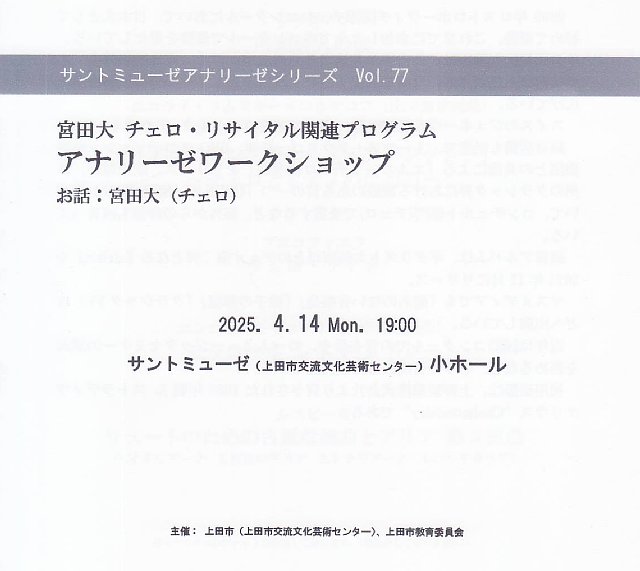 開催日:2025.4.14(月) 19:00開演場所 :上田市交流文化芸術センター サントミューゼ小ホール宮田大 チェロ・リサイタル関連プログラムのアナリーゼワークショップに行ってきました。プログラムアナリーゼレポートまずは、5月17日のリサイタルで演奏する曲の概要説明となりました。また説明しながら曲の導入部を演奏していただけたので、目と耳で曲のイメージをすることができました。そしてリサイタルで演奏するS.プロコフィエフのチェロ・ソナタOp.119にスポットを当てて詳しいアナリーゼが行われました。今回は、宮田氏が演奏する曲に対して、登場人物とストーリーを考えて貼り付けているというお話があり、楽譜に王様、王女、側近、民衆の想いが楽譜上に記されてプロジェクターで表示し、参考演奏を聴きながら詳しく追ってゆくという、これぞアナリーゼという内容でした。とは言いつつもやはり音楽家ということで、締めとして3曲を演奏していただけました。それもアナリーゼに絡めた形で勉強したことを生かして自由に想像の翼を広げて音楽を楽しむということを心掛けて欲しいということでした。そして最後に宮田氏より人生初のアナリーゼワークシッョプでした!というサプライズ発言があり、そんな貴重なひとときに同席できたことに感謝つつの終了となりました。まとめリサイタルの前に楽曲の予習として演奏者視点による演奏者の生の声を聴くことができるアナリーゼワークショップは、内容的に大変有意義なものですが、加えてリサイタルのチケットを持っていると無料で参加できるというのもお得感満載なところで、改めて素晴らしい企画だと感じました。