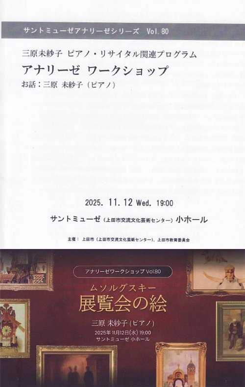 開催日:2025.11.12(水) 19:00開演場所 :上田市交流文化芸術センター サントミューゼ小ホール(320名収容)三原未紗子 ピアノ・リサイタル関連プログラムのアナリーゼワークショップに行ってきました。プログラムアナリーゼレポート10ページにおよぶフルカラーの資料が配布され、その表紙に11月22日(土)ピアノリサイタルのプログラムコンセプトとして、「ラヴェル生誕150周年」「映像が見えるような音楽」「見える芸術=視覚的モティーフ」→ムソルグスキー「展覧会の絵」が記載されており、三原氏がリサイタルにかける熱い想いが伝わってきました。まずは資料に沿ってプログラムコンセプトについてのお話。そして三原氏自身が留学時にラヴェル直系の弟子のもとで勉強した経験も踏まえて、特別な想い入れをもってラヴェルの曲に取り組んでいること。そしてラヴェルの経歴へと話が進み、その後は正面の大スクリーンに展覧会の絵の楽譜を写しながら、第1曲から第10曲までを丁寧に解説していただき、大変よい勉強となりました。60分の予定でしたが、30分延長しての濃密な時間となりました。まとめリサイタルの前に楽曲の予習として演奏者視点による演奏者の生の声を聴くことができるアナリーゼワークショップは、内容的に大変有意義なものですが、加えてリサイタルのチケットを持っていると無料で参加できるというのもお得感満載なところで、改めて素晴らしい企画だと感じました。また、これまでのアーティストは演奏会衣装で登場することが多かった印象がありましたが、三原氏は、スーツ姿で颯爽と登場し、テキパキと話を進める姿に、このアナリーゼワークショップにかける三原氏の熱い想いを感じるところでした。