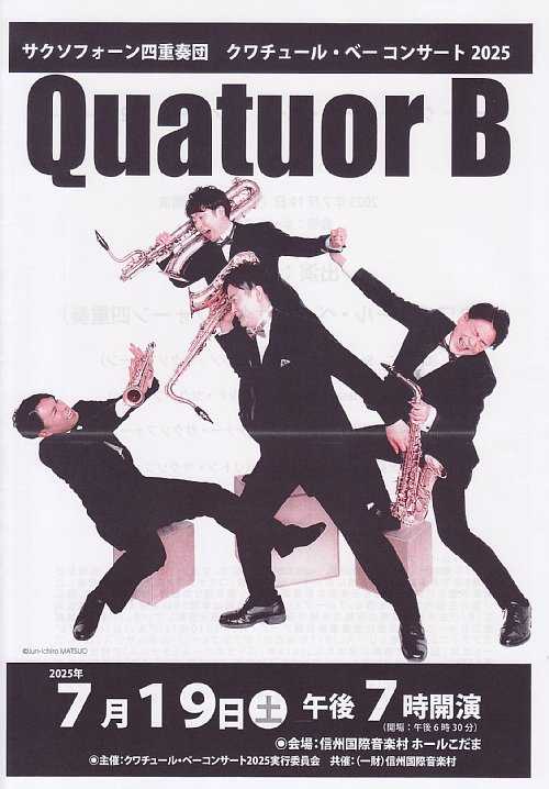 開催日:2025.7.19(土) 19:00開演場所 :信州国際音楽村 ホールこだま(300名収容)クワチュール・ベー・コンサートに行ってきました。プログラム前半1.メンデルスゾーン:弦楽四重奏のための4つの小品より「カプリッチョ」2.パスカル:サクソフォーン四重奏曲3.ハス/ヴォルカニック・アッシュ後半4.QuatuorBが贈る進化系エンターテイメント【べーかるぼっくす2025】アンコール5.to be continuedレポート弦楽四重奏のための4つの小品より「カプリッチョ」演奏後に國末氏よりメンデルスゾーンについて音楽史講義があり、モーツァルトの再来と言われたメンデルスゾーンの天才性。そして今でこそ音楽の父と言われるバッハもじつは埋もれた作曲家であり、発掘して世に知らしめたのがメンデルスゾーンだったという、知らない方には衝撃の事実では?と思う節がありました。そして演奏者視点では、もともと弦楽四重奏曲なので管楽器特有の息継ぎという概念が曲に存在しないため、演奏にあたっては非常に息継ぎが苦しいというお話もあり、確かに聴いていてこれは大変だ!と感じるところでした。またこちらの曲は、メンバーの小山弦太郎氏が編曲したものということで、自作自演の妙も楽しませていただきました。サクソフォーン四重奏曲演奏に先立って山浦氏より全4楽章の詳細な解説がありました。それぞれの楽章の特徴をイメージしつつ、楽しませていただきましたが、山浦氏より「4曲終わって、よかったら拍手いただけたらと思います!」ということで、楽章間の拍手のニアミスがないよう気配りがありました。このあたり、最近感じるのは聴き手の文化水準もこのところ上がってきているようで、楽章間に拍手してしまうというケースはあまり見かけなくなっており、この地域にも音楽文化が根付きつつあるということを感じるところです。ヴォルカニック・アッシュ演奏に先立って有村氏より楽曲紹介があり、この曲は2017年に作られた比較的新しいものであること。また「灰」をテーマにしていること。そして灰といえば火山灰ということで、有村氏の出身地である鹿児島の桜島の日常のお話もあり、鹿児島には晴・曇り・雨の他に灰という予想があることや、鹿児島弁で灰のことを「ヘ」ということなど、この曲のイメージがすっかり桜島になったところで演奏を楽しませていただきました。QuatuorBが贈る進化系エンターテイメント【べーかるぼっくす2025】後半は、前半からうってかわってエンターテイメントショーのステージとなりました。プロジェクターを使って映像による視覚的効果や各種コント類が大変素晴らしく思い切り笑って拍手する夢のようなひとときになりました。レポート的にはその素晴らしい内容を書きたいところではありますが、これからこの素晴らしいエンターテイメントを初めて体験する皆さんの楽しみを奪ってしまってもいけないので、あえて伏せておくこととします。to be continuedアンコールは、これからもクワチュールベーの活動が続くことを願いつつ、クワチュール・ベーのテーマ曲で幕引きとなりました。まとめ昨年に続き、クワチュール・ベーのコンサートを拝聴させていただきましたが、前半の大真面目なステージと後半のエンターテイメントステージの構成のわかりやすさと、メンバーお一人お一人がそれぞれ自分の言葉でお話をするというところは変わらずで、とても親近感を感じました。また今回もサイン会ありということで、メンバー全員とお話させていただくことができる素晴らしい機会となりました。