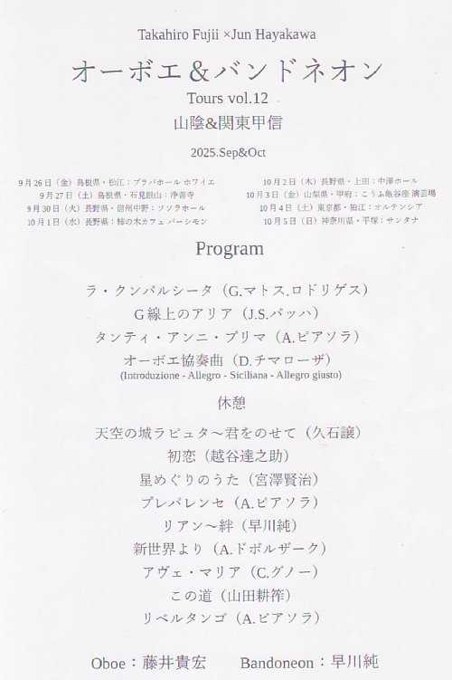 開催日:2025.10.2(木) 19:00開演場所 :中澤ホール(40名収容)オーボエ&バンドネオン Tours vol.12へ行ってきました。プログラム前半1.ラ・クンパルシータ / G.マトス.ロドリゲス2.G線上のアリア / J.S.バッハ3.タンティ・アンニ・プリマ / A.ピアソラ4.オーボエ協奏曲 / D.チマローザ後半5.天空の城ラピュタ~君をのせて / 久石譲6.初恋 / 越谷達之助7.星めぐりのうた / 宮澤賢治8.プレパレンセ / A.ピアソラ9.リアン~絆 / 早川純10.新世界より / A.ドボルザーク11.アヴェ・マリア / C.グノー12.この道 / 山田耕筰13.リベルタンゴ / A.ピアソラアンコール14.ガブリエルのオーボエ / E.モリコーネ15.もののけ姫 / 久石譲レポートラ・クンパルシータまずは1曲ということでコンサートが始まりました。こちらの曲は、タンゴの代名詞とも言うべき有名な曲ではありますが、アルゼンチンではなくウルグアイの学生が書いたということで曲のメジャー度からすればいかにも巨匠が書いたのだろうと思っていたところ、意外や意外、先入観はあてにならないなと改めて感じました。G線上のアリアバッハの代表的な楽曲ですが、哀愁をおびたオーボエの音色と教会のオルガンを連想させるバンドネオンの響き…。この2つの音色の融合は神々しいものがあり、会場となった中澤ホールのビジュアル的な効果もあいまって、なんともいえない幸福感を感じることができました。讃美歌~失われし時のワルツプログラムには無かったのですが、バンドネオンの起源のお話、そして教会でオルガンの代わりとして使われたという話からの讃美歌の実演。また詳細なバンドネオンのメカニカルの紹介の後のデモ演奏として早川氏作曲の失われし時のワルツが披露されました。タンティ・アンニ・プリマ日本語で昔々という意味を持つピアソラの楽曲ですが、題名通り過去を回想する時に流れるような音楽のようで、とてもしみじみとした曲調がとても印象的でした。ピアソラといえばタンゴの破壊者としてのイメージが強いですが、じつはこんなしっとりとした曲も書いていたのだなと感じた次第です。オーボエ協奏曲オーボエのために書かれた本日のメイン曲という位置づけの楽曲としての演奏になりましたが、バッハより前の時代の古い曲のですが、哀愁もあってなかなか面白いとのことで、聴いてみて確かにテクニカルなところもあって、オーボエの音色の特徴をよく生かしているなという印象がありました。天空の城ラピュタ~君をのせて後半のスタートは、早川氏よりオーボエ&バンドネオンの組み合わせは、久石譲氏の曲と相性が良いのではないかと思い、いろいろアレンジしています!とのことで、その1発目の披露として豪華な前奏のついた君をのせての演奏となりました。印象的にオーボエとバンドネオン双方で多くの装飾が入り、これを吹きこなすプロの演奏家ならではの醍醐味を感じたひとときになりました。初恋~星めぐりのうた日本の歌2曲の披露となりました。初恋は、早川氏が学生時代にいい曲だなと感じて、いつかやろうと温めていた曲ということで、ぜひこの機会にみなさんに知っていただきたいとのことで、心して拝聴させていただきました。実際に聴いた感想とすれば、その語り掛けるような温かなメロディーがとても印象的でした。星めぐりの歌は、どこか銀河鉄道999を連想させるような情景が浮かんできて、大らかに、かつ自由気ままに星を旅をする印象がありました。プレパレンセ演奏に先立って早川氏よりピアソラについてのお話がありました。ピアソラあるあるとして、当初ピアソラはクラシックの音楽家を目指していたが、師匠に良く書けているけど独創性が無いね…ということになり、師匠からそもそもあなたは祖国アルゼンチンでどんな音楽をやっていたの?となり、封印していたタンゴをしぶしぶ披露したところ、師匠から「それこそがあなたの音楽だ!」となり、一大決心をして故郷に戻って最初に書いた曲がこの曲。直訳すると「用意はいいか?」だったとのことで、後に新しいタンゴの名曲の数々を世に送り出すピアソラの原点ともいうべき楽曲で、そこには野心のようなものが感じられるとのことで、実際の演奏からはまさにそんな雰囲気が漂ってくるところがありました。リアン~絆早川氏による曲で、もともとはバンドネオンとコントラバスのために書いた曲とのことでしたが、人と人の絆は思わぬところからできるもの…。早川氏と藤井氏の絆もしかり。というお話もあって、改めて絆や縁といったものに想いを馳せたひとときになりました。またこの曲では、藤井氏がイングリッシュホルンに持ち替えての演奏で、そのオーボエより低めの響きを堪能させていただいた次第です。新世界よりイングリッシュホルンといったらこの曲でしょう!ということで8分くらいの曲を聴きやすく3分くらいに縮めての演奏となりました。この曲は、抜粋した「家路」もよく知られている訳ですが、今回はそれ以外の部分のフレーズも組み込まれてい