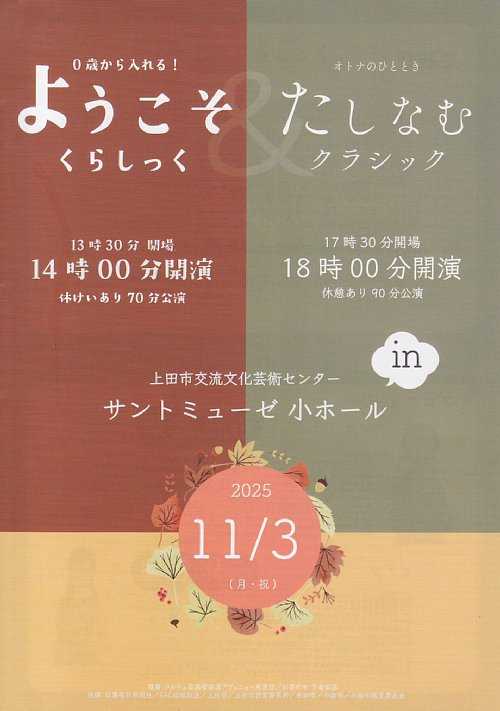 開催日:2025.11.3(月) 18:00開演🌙場所 :上田市交流文化芸術センター サントミューゼ小ホール(320名収容)オトナのひととき たしなむクラシックへ行ってきました。プログラム前半1.D.ベダール/ファンタジー2.フランス民謡 編曲:高橋宏樹/アヴィニヨンの橋の上でin Jazz3.S.ラフマニノフ 編曲:石川亮太/ラフマニノフのアダージョ4.高橋宏樹/ガーネット・ゼロ後半5.R.ボノー/ワルツ形式によるカプリス(Saxソロ)6.C.ドビュッシー/月の光7.D.ミヨー/スカラムーシュ8.石川亮太/四季のファンタジアアンコール9.石川亮太/信濃の国レポートファンタジーオープニングは、現代作曲家のベダールによる楽曲で、クラシック的な要素にフランス音楽の香りが感じられるとのことで、まずはお二人が奏でるハーモニーの世界を楽しませていただきました。アヴィニヨンの橋の上でin Jazz演奏に先立って小林純菜氏より、自らは大学でクラシックを専攻していたこと、サクソフォーンといえばジャズの印象が強いが、こちらの楽曲はクラシックを基本としつつもジャズの要素を取り入れて作られたもので、クラシック奏者がジャズを演奏したらこんな感じになるということを楽しませていただきました。考えみれば、クラシック音楽はまず楽譜という絶対的な設計図が存在し演奏者はそれをどう読み取って演奏するかというものですが、ジャズは演奏者が演奏する場で音楽を紡ぎ出すもの…ということで、そういう観点からすれば、大枠としてはクラシック音楽の範疇なのだろうと感じました。ラフマニノフのアダージョラフマニノフの交響曲第2番 第3楽章アダージョ部分に登場するロマンティックな旋律を取り出してソプラノサクソフォーンとピアノの二重奏用にアレンジした曲とのことですが、ソプラノサックスの甘い音色を存分に堪能できる楽曲で、コンサートの1ピ―スとして秀逸と感じました。小林純菜氏と小林百香氏との絡みの素晴らしさも存分に感じさせていただきました。ガーネット・ゼロ小林純菜氏の師匠である小山弦太郎氏が作曲家の高橋宏樹氏に委嘱した楽曲で、曲名に「GENTARO」が隠されているという秘話もありということでした。楽曲は人生を走馬灯のように振り返るような壮大なテーマを感じることができ、いろいろな想いがこもった師匠の楽曲を弟子の若き演奏家が演奏するというシチュエーションにも感動を覚えたひとときになりました。ワルツ形式によるカプリス後半のスタートは、サクソフォーンソロでの演奏となりました。この曲は、大学の入試などでもよく演奏される曲だそうで、カプリスとは気まぐれを意味するものであり、まさにそんな気まぐれ屋さんが、思い思いの音符を連ねた…そんな印象のある曲でした。月の光続いてはピアノソロとなりました。演奏に先立って印象主義・印象派についてのお話がありましたが、ドビュッシーの音楽も月とか海などを題材にした楽曲が多いことから、まさに印象派の代表格と言えるかもしれませんが、ドジュッシー自身はそう言われることを嫌がっていたそうで、芸術家のこだわりはわからないです。そして演奏された月の光は、あまりにも有名な曲なので、演奏家の個性をより感じやすいところがあり、そういった意味で小林百香氏の紡ぎ出す世界を垣間見た印象がありました。スカラムーシュスカラムーシュとは道化師(ピエロ)を意味する言葉で、ピエロの何たるかをフランスの作曲家ミヨーが描いた楽曲ということで、3楽章からなっていますが、その中でも3楽章のブラジレイラは、私も何度か聴いたことがあり、今回ブラジレイラに続く1・2楽章も合わせてフルで聴くことができ、ようやくつながった感がありました。四季のファンタジア16分におよぶ大曲ですが、楽譜販売元の曲紹介によれば、「春から夏まではアルトサックスによる演奏で「花」「朧月夜」「茶摘み」「浜辺の歌」、秋はソプラノに持ち替え「村祭」「紅葉」「赤とんぼ」と続きます。独奏により表現される厳しい冬の訪れ、そして「ゆき」と「冬景色」。最後はまたアルトに戻り壮大なフィナーレを迎えます。」とのことで、古き良き日本の四季の童謡をとてもお洒落にまとめたとてもステキな曲という感想を持ちました。信濃の国アンコールは、クラシック風信濃の国ということで、短調になった信濃の国も楽しめるじつに面白い作品で、もともとはオーボエとピアノを想定して書かれた楽曲のようですが、今回ソプラノサクソフォーンでの演奏となり、もともとオーボエとソプラノサクソフォーンは音域的に近しいところがあり、またサクソフォーン特有の艶深い音色とともに楽しませていただきました。まとめこのコンサートは、日中に行われた「0歳から入れる!ようこそくらしっく」と夜間の「オトナのひととき たしなむクラシック」の2本立ての企画の中の夜間の部という位置づけでしたが、同じ演奏者が毛色の異なる2つのコンサートを同日に開催するという企画力の秀逸さもさることながら、そ