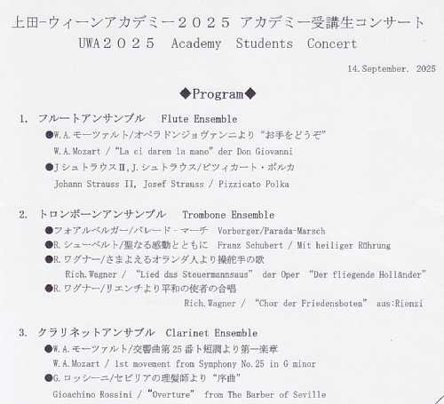 開催日:2025.9.14(日) 14:00開演場所 :信州国際音楽村 ホールこだま(300名収容)9月12日から開講した上田ウィーンアカデミー2025のアカデミー受講生コンサートに行ってきました。プログラム1.フルートアンサンブル ●W.A.モーツァルト/オペラ ドンジョヴァンニより「お手をどうぞ」 ●J.シュトラウスII,J.シュトラウス/ピツィカート・ポルカ2.トロンボーンアンサンブル ●フォアルベルガー/パレード・マーチ ●R.シューベルト/聖なる感動とともに ●R.ワーグナー/さまよえるオランダ人より操舵手の歌 ●R.ワーグナー/リエンチより平和の使者の合唱3.クラリネットアンサンブル ●W.A.モーツァルト/交響曲第25番ト短調より第一楽章 ●G.ロッシーニ/セビリアの理髪師より序曲レポートフルートアンサンブル今回のフルートアンサンブルは、モーツァルトのオペラ曲でおなじみのお手をどうぞと、生誕200周年のヨハン・シュトラウスII世と弟ヨーゼフ・シュトラウスの合作によるピツィカートポルカの2本立てのプログラムでしたが、1曲目はフルートらしい淡色のやさしい音色が楽曲のほのぼのとした雰囲気とよくマッチして大変心地よく感じられました。2曲目のピツィカートポルカは、弦楽器のピツィカート感をどう再現するのか…ということが大いに興味深いところでしたが、歯切れよく音を切る奏法を取ることで縦割り感のある粋な音楽をとてもよく表現していると感じました。トロンボーンアンサンブルハーモニーを得意とするトロンボーンによる9重奏となりましたが、1曲目のマーチは高音のパリッとした音色がよく通る小気味よい曲で躍動感が素晴らしく、2曲目の聖なる感動とともには讃美歌のような聖なる響きがまるで教会にいるような厳かな気持ちになるところ。3曲目のさまよえるオランダ人は、アカデミー最終日の大編成ウインドアンサンブルの演目にもなっている曲で、それをトロンボーンアンサンブルで!ということで、その違いなどをとても興味深く聴かせていただきました。4曲目のリエンチより平和の使者の合唱は、演奏に先立って市村先生より、昨今の戦争が絶えない世界情勢への憂いのコメントがあり、そんなお言葉をかみしめながらの拝聴となりました。クラリネットアンサンブル今回も縁あって、チームの一員として参加させて頂きました。交響曲第25番は、モーツァルトとしてはめずらしい短調の曲で、大変有名な曲でもありますが、事前に受けたヤイトラー氏のレッスンで音符の処理が大きく変わったことで、それまで演奏していたアンサンブルチームとしての曲キャラクターが大きく変わったようなイメージがありました。これはまさにヤイトラー氏のマジックというところです。そしてセビリアの理髪師より序曲は、曲の導入部からのスローテンポな部分と後半の疾走するような部分に分かれますが、私自身は、このスローテンポな部分のロッシーニらしいユーモア感にあふれた曲調がとても好きでいつも楽しい想像をしつつ、取り組ませていただいた感があり、その集大成がこのアカデミー受講生コンサートということで感無量なところがありました。