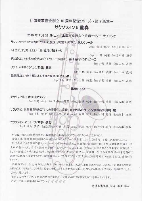 開催日:2025.7.26(土) 14:00開演場所 :上田市交流文化芸術センター サントミューゼ大スタジオU演奏家協会創立10周年記念シリーズ~第2楽章~ サクソフォン5重奏に行ってきました。プログラム前半1.サクソフォンデュオの為のソナタ ハ長調より第1楽章/J=M.ルクレール2.44のデュオより 9.6.1.41.39番/B.バルトーク3.チェロとコントラバスのためのデュエット ニ長調より 第1楽章/G.ロッシーニ4.ソナタ ヘキサグララミック/日景貴文5.民謡風ロンドの主題による序奏と変奏/G.ピエルネ後半6.アラベスク第1番/C.ドビュッシー7.サクソフォン5重奏のための2つの情景 I.寄港 II.渡り鳥の踊りと祝祭の踊り/川崎龍8.サクソフォン・パラダイス/本多俊之アンコール9.ヤンキードゥードル(アルプス一万尺)レポートサクソフォンデュオの為のソナタ ハ長調より第1楽章アルトサクソフォンによる2重奏の演奏となりました。演奏後、川島氏より、アルトサクソフォンは、サクソフォンを扱う私たちにとっては基本の楽器で、全員が吹けるものであるというお話がありました。このあたり、クラリネットの基本がB♭クラリネットであるように、サクソフォンはアルトが基本ということで、そんな原点とも言うべきアルトサクソフォーンによる2重奏でまずはサクソフォンの世界へと誘われた形となりました。44のデュオより 9.6.1.41.39番続いてはソプラノサクソフォーンの2重奏という、サクソフォーンアンサンブルでは花形とも言えるソプラノ同士によるじつに興味深いアンサンブルを聴かせていただきました。こちらは5曲演奏となりましたが、1曲が1分程度という聴きやすい尺も手伝って、とても簡潔にソプラノ同士のハーモニーの何たるかをじっくりと楽しませていただきました。チェロとコントラバスのためのデュエット ニ長調より 第1楽章続いては、テナーとバリトンによる二重奏となりました。演奏に先立ってテナーの甘利氏より楽器の特徴と演奏するロッシーニについてお話がありましたが、セビリアの理髪師といった具体的な曲目が上がってくると身近に感じられるところでした。表題から察するに、原曲はチェロとコントラバスでテナーとバリトン用に編曲したものなのかもしれません。このあたり、今年に入ってからチェロは宮田大氏、コントラバスは髙橋洋太氏のコンサートを聴く機会があったので、そんな弦楽器の音色も頭に浮かべつつも艶深いテナーとバリトンの絡みを大いに楽しませていただきました。ソナタ ヘキサグララミック演奏に先立って山本氏からサクソフォンアンサンブルについての魅力についてお話がありました。今回のコンサートが、だんだん演奏者の人数が増えてゆく(デュオ→トリオ→カルテット→クインテット)ので音楽用語的に言うとクレッシェンド形式のコンサートである旨の説明があり、なるほど!と感じた次第です。そしてここからはサクソフォンのために書かれたオリジナル曲ということで、ガラリと雰囲気が変わり、これぞサクソフォーンアンサンブル!という絡みをアルト・テナー・バリトンのトリオ編成にて大いに楽しませていただきました。民謡風ロンドの主題による序奏と変奏演奏に先立って作曲者のG.ピエルネについてお話がありました。G.ピエルネは、指揮者としても有名でダフニスとクロエや火の鳥を初演したことで有名とのことでした。そしてこの曲ではサクソフォーンの各楽器が1名づつのカルテットとなり、上から下まで揃ったサクソフォンアンサンブルの醍醐味を大いに感じることができました。アラベスク第1番後半は5名全員が揃ってのクインテット(ソプラノ1名、アルト2名、テナー1名、バリトン1名)での演奏となりました。この曲がどんな曲かちょっと調べてみたところ、いわゆるドビュッシーとしての輝かしい名曲群が生まれるより前の時代にドビュッシーが生活のために万人受けを狙って書いた楽曲であり保守的でもあり、ある意味ドビュッシーらしくない部分があるようですが、音楽としては親しみやすい面があるのかなという印象で、後半の始まりにはぴったりなのかもと感じました。サクソフォン5重奏のための2つの情景 I.寄港 II.渡り鳥の踊りと祝祭の踊り川島氏の大学の同期の川﨑龍氏によるオリジナル作品とのことで、アニメーション音楽を得意とする同氏の繰り出すいろいろな仕掛けが特徴的とのことでした。この曲はアンサンブルコンテストでも広く演奏されているようで、そういった意味ではプロのサクソフォーン奏者によるお手本演奏といった意味合いも感じられました。サクソフォン・パラダイス3楽章に渡る楽曲で、ジャズの要素が入った曲とのことでしたが、どこか現代曲のようでもあり、演歌的でもあったりとサクソフォン特有のグリッサンドやしゃくりあげのような奏法も登場して面白いと感じました。この曲は、サクソフォーンアンサンブルの草分け的存在であるトルヴェールクァルテットのために書かれた曲だそうで、そういった意味では、これまでに数えきれな