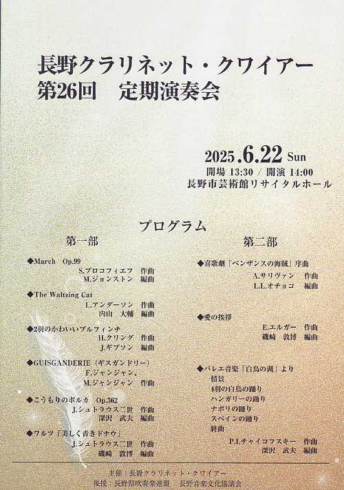 開催日:2025.6.22(日) 14:00開演場所 :長野市芸術館 リサイタルホール (293名収容)昨年に続き、クラリネットだけで作るオーケストラである長野クラリネットクワイアーの演奏会に行ってきました。また縁あって、今回も演奏者として参加させて頂くことになりましたので、演奏者視点でのレポートも加わります。プログラム第1部1.March Op.992.The Waltzing Cat3.2羽のかわいいブルフィンチ4.GUISGANDERIE(ギスガンドリー) クラリネット・ソロ 春山俊介5.こうもりのポルカ Op.3626.ワルツ「美しき青きドナウ」第2部7.喜歌劇「ペンザンスの海賊」序曲8.愛の挨拶9.バレエ音楽「白鳥の湖」より 情景 ハンガリーの踊り ナポリの踊り スペインの踊り 終曲アンコール10.口笛吹と犬11.聖者の行進(ドナウ風)編成レポート 本日のクラリネットクワイアーの全編成は下記のようでした。 Eフラ クラリネット 2名 Bフラ クラリネット 23名 アルト クラリネット 7名 バス クラリネット 6名 コントラアルト クラリネット 4名 コントラバス クラリネット 2名また 「東京クラリネット・クワイアー」 「金沢クラリネット・クワイアー 「船橋ブレス・クラッツ」 「クラリネット・フィルハーモニー名古屋」 「浜松クラリネット・クワイアー」 「和歌山クラリネットファミリー」 「松本クラリネット・アンサンブル」 「長野市民吹奏楽団」 「メセナ市民交響楽団」 「ちるくま音楽隊」 「ウィローウインドオーケストラ」 の皆さんが賛助で参加しておられました。演奏レポートMarch Op.99曲目解説によれば、プロコフィエフが1944年に放送局のテーマ音楽として作曲した吹奏楽のための作品とのことで、オープニングにふさわしい疾走感あふれる曲調がとても印象的でした。またもともとが吹奏楽曲ということで、中低音パートにも旋律が回ってくる構造になっており、みんなでごあいさつ代わりに!といった雰囲気もありました。余談ながら、プロコフィエフのマーチといえば、昨年の今時分に南紫音氏のヴァイオリンコンサートで『3つのオレンジへの恋』より「マーチ」を何度か聴いたことがあり、その後のリサイタルでは、プロコフィエフのヴァイオリン・ソナタ第1番を拝聴し、プロコフィエフがちょっとしたマイブームになっていたこともあり、そんなこんなで今度は自身がプロコフィエフの曲を演奏できたことが感慨深いものがありました。The Waltzing Cat演奏に先立って稲垣先生のお話ということで、楽しい曲をたくさん作ったアンダーソンについて触れられ、代表曲を数曲挙げられた中で、タイプライターがあり、これはつい先日の軽井沢ファミリーオーケストラで演奏を聴いたこともあって、楽器だけでなくタイプライターの打音まで音楽に取り込んでしまうアンダーソンの視野の広さに感嘆を禁じ得ないところですが、このワルツィング・キャットは、楽器でネコの鳴き声を取り入れた面白い曲で、鳴き声のニャーオをグリッサンドで表現しているところがじつにチャーミングで楽しい感じがありました。また終盤には、イヌが登場。これは人間がワンワンワン!と叫ぶ訳ですが、なかなか面白いアイデアと感じました。2羽のかわいいブルフィンチそもそもブルフィンチって?ということですが、スズメ目アトリ科ウソ属に分類される鳥類の一種で、鷽(ウソ)のことのようです。そんなウソの口笛のような鳴き声を音楽にしたのがこの曲で、2羽の鷽が会話するように、歌を歌うようにといったイメージがあり、2羽の鷽を見立てたソリストお二人が前に出ての演奏となりました。GUISGANDERIE(ギスガンドリー)作曲者のジャンジャンの友人のクラリネット奏者であるHenri Guisgand(アンリ・ギスガン)のために作曲された楽曲ですが、今回の演奏では、ゲストの春山俊介氏がソロを務め、ハイスピードなテンポ感に加えて、超高音も要求されるなかなかの難易度の曲でしたが、春山氏のスペシャルな演奏はじつにお見事で、感動した次第です。こうもりのポルカ Op.362ここからはヨハン・シュトラウス二世の生誕200年の記念演奏ということで、まずはウインナポルカの最高峰と言われる喜歌劇「こうもり」よりこちらの曲の演奏となりました。曲調は、これぞシュトラウスのポルカということで、おなじみ感満載でした。ワルツ「美しき青きドナウ」曲目解説においてウインナ・ワルツの傑作中の傑作と紹介されており、オーストリアの第2の国歌とも言われる名曲中の名曲ですが、私自身にとっては聴く機会は1月2日の中継で聴くウィーンフィルのニューイヤーコンサートや信州国際音楽村のニューイヤーコンサートなど多いのですが、演奏する機会となると2010年の上田ウィーンアカデミー以来というしばらくぶりで、楽譜を見てそういえばこんなテンポ感だったな…とか、第1ワルツ、第2ワルツ~コーダといった曲の流れまで、内側から見るドナウを堪能させていただくことができました。喜歌劇「ペンザンスの海賊」序曲こちらの曲は、イギリスの作曲家アーサー・サリヴァンが劇作家ウ