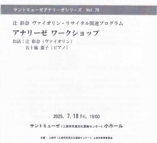 開催日:2025.7.18(金) 19:00開演場所 :上田市交流文化芸術センター サントミューゼ小ホール(320名収容)辻彩奈 ヴァイオリン・リサイタル関連プログラムのアナリーゼワークショップに行ってきました。プログラムアナリーゼレポートリサイタルで演奏するサン=サーンスのヴァイオリン・ソナタ第1番、イザイの悲劇的な詩にスポットを当ててアナリーゼが行われました。まずはサン=サーンスのヴァイオリン・ソナタ第1番について、プロジェクターに楽譜を投影し、参考演奏をかけながら、辻氏が説明しながら丁寧に楽曲を紐解いて行くという形で、視覚的な音符の並びと聴覚的な音源という2つでより直感的に曲を学ぶことができました。続いてイザイの悲劇的な詩では、ピアノの五十嵐氏も登場して辻氏の演奏を絡めながらの解説となり、特殊なチューニングでヴァイオリンだがヴィオラ的な響きが感じられる曲とのことで辻氏も「私の楽器でこんな音が出せるなんて!」と新しい発見があったとのことです。締めには、辻氏より「ここまでアナリーゼを聴いていただいたお礼に…。」という形で、先日の地域ふれあいコンサートでも演奏されたサラサーテのツィゴイネルワイゼンを聴かせていただました。このあたり、小ホールでの響きで聴けるのは今夜限りと考えるととても貴重な演奏を聴けた感があり、また尺的にも予定1時間のところ15分ほど延長しての充実の内容。さらには、終演後にお見送りまでしていただけるという至り尽くせりのアナリーゼワークショップとなりました。まとめリサイタルの前に楽曲の予習として演奏者視点による演奏者の生の声を聴くことができるアナリーゼワークショップは、内容的に大変有意義なものですが、加えてリサイタルのチケットを持っていると無料で参加できるというのもお得感満載なところで、改めて素晴らしい企画だと感じました。また今回、辻氏のお話をたくさん聴けた中で、演奏家として作曲家に物申す!といったシチュエーションにおいて「戯言ですが…。」と遠慮がちにお話されていましたが、これは過去にピアニストの酒井有彩氏もリヒャルト・シュトラウスはなかなか手になじまない…といったお話をされており、私自身もアマチュアながら演奏する時に困難な運指に遭遇すると「これって楽器のこと知らないで書いているよね…。」と感じる場面があり、とても共感できるところがありました。