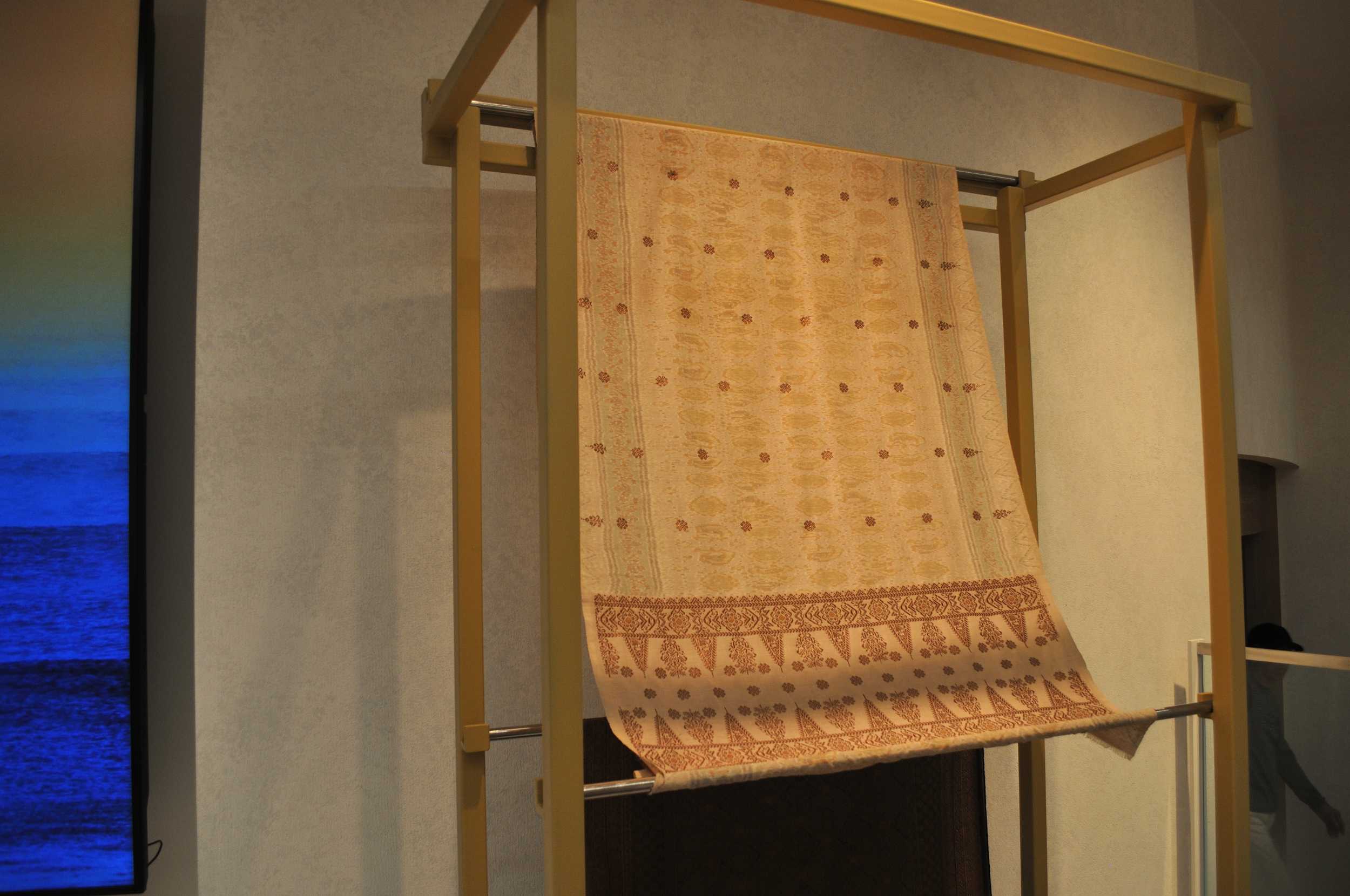 この展示スペースにはベンチもあり腰かけることができますが、せっかくの織物をじっくり見られなかったのが残念。