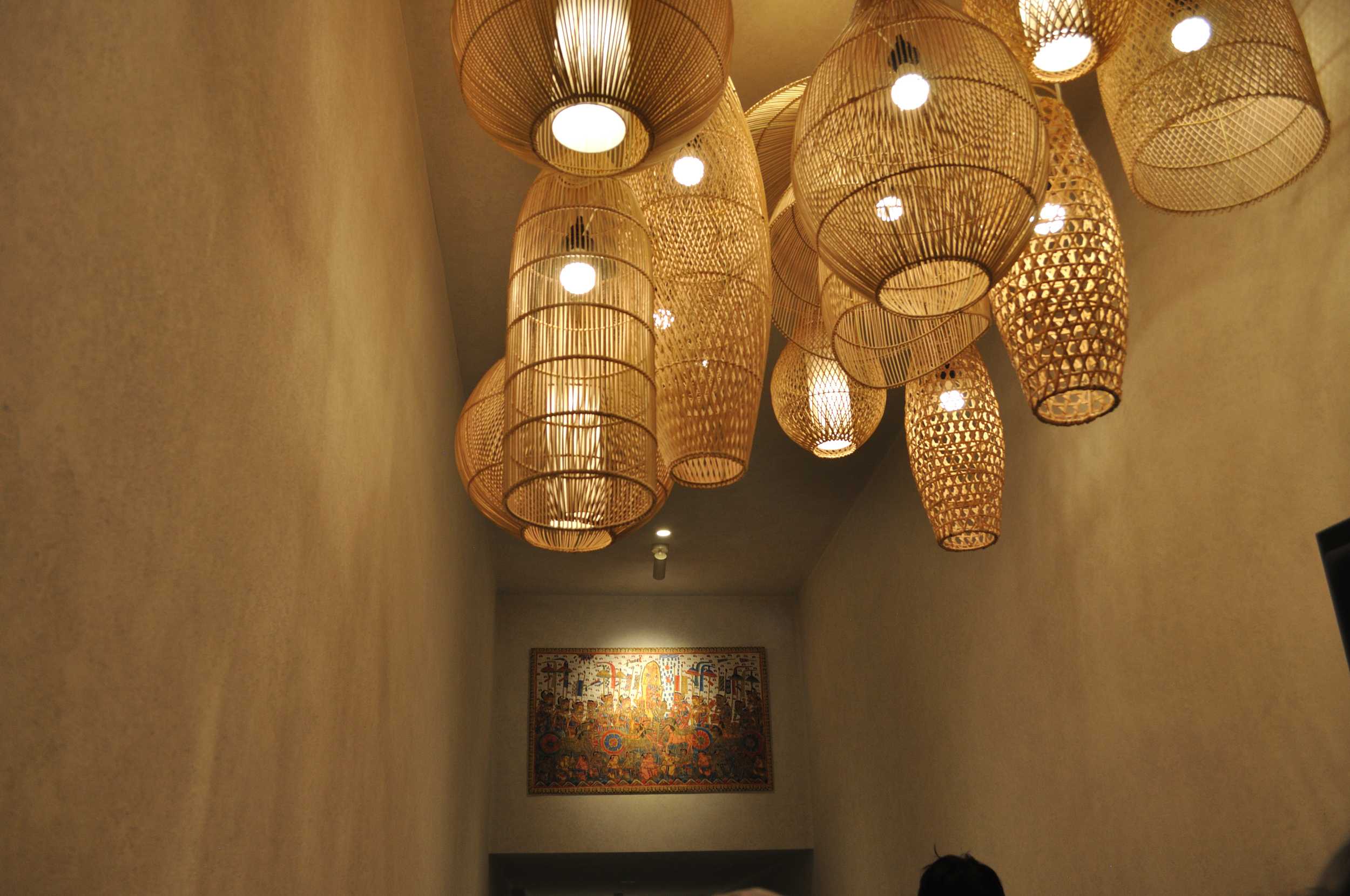 上映が終わり、出口への階段。照明のこれも伝統工芸品をモチーフにしたもののようです。