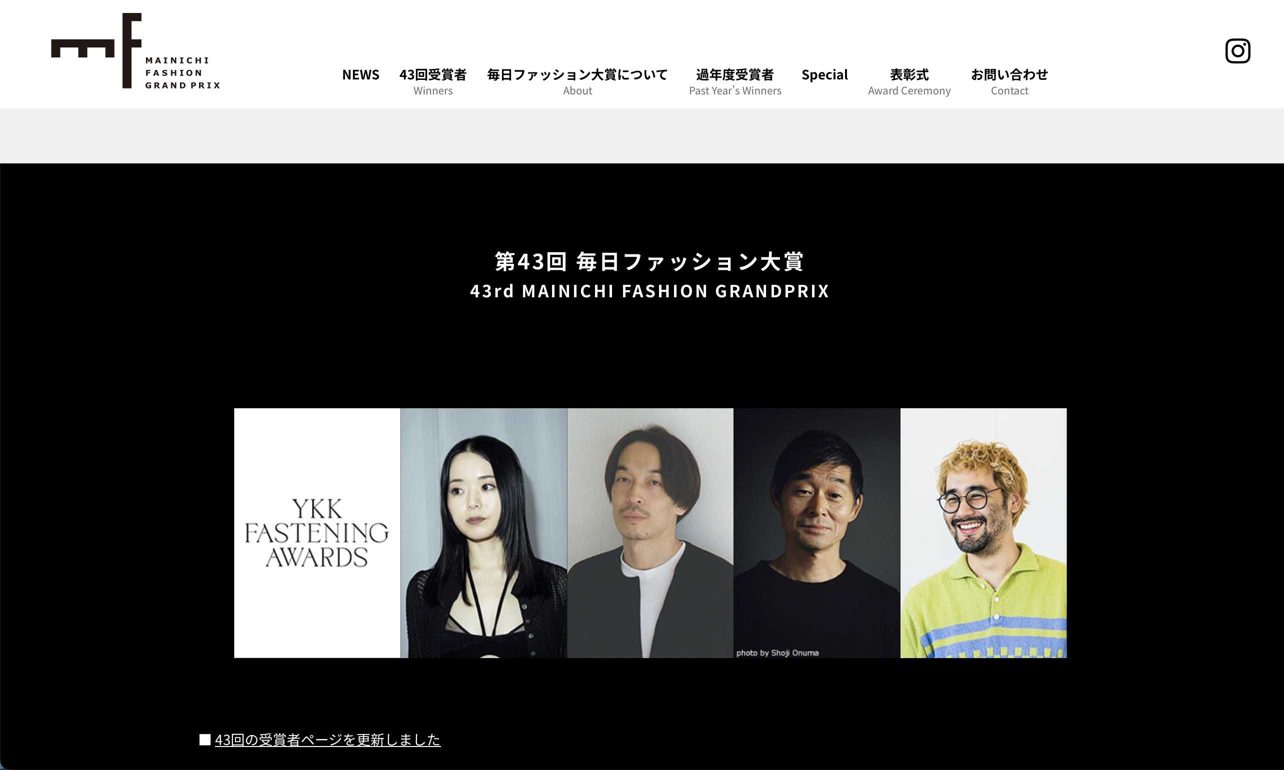 10月23日大手町三井ホールで本年度毎日ファッション大賞授賞式が行われました。今年で43目の開催、私は1989年から1994年までと2013年から今年まで選考委員としてお手伝いしてきました。途中ブランドがあるのは、1995年一般企業に移籍したので賞の公平性を保つために退任したから。本年度の大賞はAURALEEのデザイナー岩井良太さん、新人賞(デビュー5年以内の規定あり)はFETICOのデザイナー舟山瑛美さん、鯨岡阿美子賞は株式会社糸編代表取締役の宮浦晋哉さん、選考委員特別賞には今年創業30年を迎えたmina perhonen創業デザイナー皆川明さん、話題賞はYKKファスニングアワードを主催するYKKに。受賞者の記念撮影オーラリーは2019年新人賞を受賞。その後毎シーズンパリでコレクション発表しています。日本の職人さんたちと取り組む丁寧なものづくりには定評あり、メディアをびっくりさせるようなコレクションではありませんが内外のバイヤーにはファンがどんどん増えています。大賞 岩井良太さんフェティコの舟山さんはデビュー以来毎年新人賞候補にノミネートされてきた注目の新進デザイナー、今年やっと受賞することができました。女性の身体の美しさを強調するコレクションは毎回ブレがなく、委員の皆さんから高く評価されての受賞。この先もあれもこれもと欲張りにならず固有の世界観を深掘りして欲しいです。新人賞 舟山瑛美さん2枚とも授賞式後のFETICOショー長年ファッション業界に貢献してきた方を選ぶ鯨岡阿美子賞(初期の毎日ファッション大賞選考委員長だった故人の名を残すために設立された業界功労賞)は日本の多くの繊維産地を走り回り、産地の技術とブランド側のクリエーションを繋いできた宮浦晋哉さんに贈られました。年々廃業件数が増える地方の繊維産地をなんとか元気にしようと奔走する姿を評価しての表彰です。鯨岡阿美子賞 宮浦晋哉さん今年創業30周年を迎えたミナペルホネン、創業以来ずっと日本の小さな織物工場とコツコツもの作りをしてきた皆川明さんの姿勢を称えようと、今年は特別な賞を贈ることが決まりました。シーズンごとに生地メーカーを変えることなく長くお付き合いすることで定期的に中小の工場に仕事を出す姿勢、多くの後進デザイナーには見習って欲しいですね。選考委員特別賞 皆川明さん世界のファスナー業界を牽引するYKKがファッション専門学校生らを対象にこれまで25年間も運営してきたYKKファスニングアワード、この賞にエントリーし作品を創作することで学生たちは布とファスナーの関係を肌で感じ、将来産業界でものづくりする上で必要な知識、技術を身につけます。アワードの意義、長年の運営努力を評しての話題賞です。話題賞 YKKファスニングアワード受賞者の皆様とその関係者の皆様、おめでとうございます。これからもますますのご活躍をお祈りしております。詳細は以下の主催者公式サイトをご覧ください。https://macs.mainichi.co.jp/fashion/win43/index.html