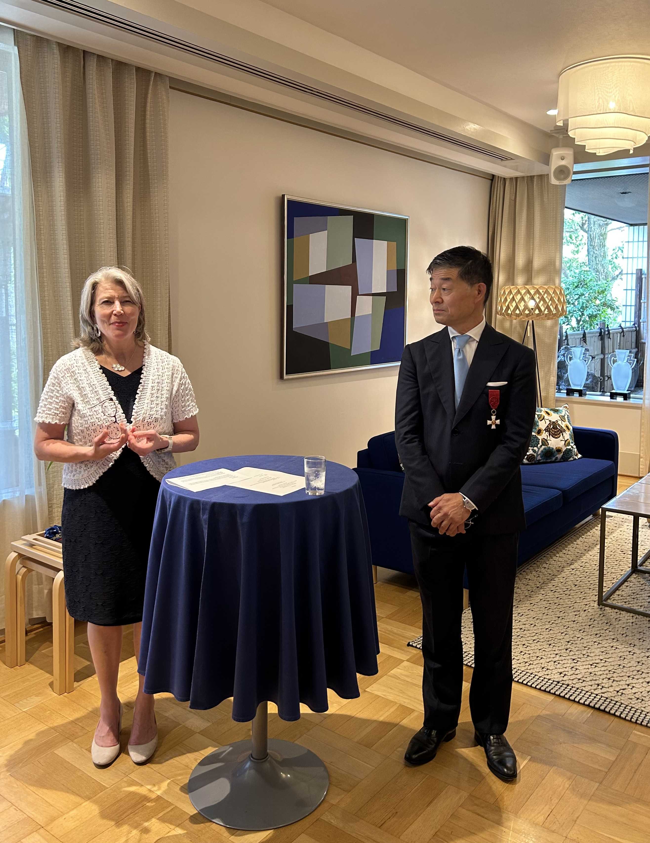 昨日、南麻布のフィンランド大使館でミナペルホネン創業デザイナー皆川明さんの同国騎士(獅子)勲章受章のレセプションがありました。一般民家のリビングルームのような部屋に20人ほどの招待客が集まった非常にアットホームなレセプション、いかにもミナペルホネンらしい和やかな雰囲気でした。冒頭タンヤ・ヤースケライネン駐日大使(女性)から皆川さんとフィンランドのつながりについて説明がありました。フィンランド大使と皆川明さんいまから40年ほど前、皆川青年は憧れの地フィンランドを訪れ、首都ヘルシンキから電車で10時間の遠隔地にある街でたまたま見つけた厚手コートを衝動買い、所持金の4分の3がたった1着のコートに消えてしまいました。所持金が少なくなった若き旅人にフィンランド人は長距離列車食堂車や自宅ディナーに招いてご馳走してくれ、皆川さんはフィンランド人の温かさに触れたそうです。そして、このコートとの出会いがのちのミナペルホネン(ペルホネンはフィンランド語「蝶」)のクリエーションとものづくりの源泉となりました。ミナペルホネンは今年創業30周年、全国各地に直営店が増え事業は年々拡大しています。5月30日には池袋の自由学園明日館で記念パーティーがありました。会場には創業時から今年までの軌跡がパネル表示され、私たち招待客はパネルを読みながら「こんなこともあったなあ」、「この年に発表された作品かあ」と30年間を振り返りました。私も事前にメッセージを求められたので、皆川さんがまだミナペルホネンを創業する前に八王子の若手デザイナー合同展示会で初めて出会ったときのことを書きました。私塾月曜会の教え子だった文化服装学院生の作品を見に出かけたところ、たまたま隣のブースが皆川さんでした。30周年展示パネルの1枚目創業前後ミナペルホネン創業直前のことをメモ書きしました2025年のパネル以来、ミナペルホネンの展示会には何度もお邪魔して新しく開発した布地や新作についてご本人から詳細説明を受けてきました。昨年は二度も中国出張セミナーとニュージーランド牧羊農場視察にご一緒するなど懇意にしてもらっています。多くの同世代デザイナーがパリコレや東コレのファッションショーでその存在感を見せようとしていますが、皆川さんは莫大な費用がかかるショーでなく(当初はショーも開催)、毎シーズンしっかり商品説明できる展示会でコツコツとファンを増やし、直営ショップを各地に広げてきました。また、海外のミュージアムでいろんな展覧会を開催、自身のクリエーション発信を続けてきた点も異色です。昨年末ソウル市デザインミュージアムでも展覧会ブランドの起源とも言えるフィンランドの企業と商品開発を共同で進めてきたことが今回のフィンランド勲章受章につながりました。ブランドの原点でもあるフィンランド政府から格別の勲章を授与されるのですから、ご本人は感慨深いものがあったのではないでしょうか。また、フィンランド政府はいいところに目をつけたとも言えるでしょう。中国やニュージーランド出張時、皆川さんがサインを求められると、ただ名前をサインするだけでなく、皆さんにメルヘン調の動物イラストを丁寧に描いて渡しています。そんな人柄ですから、セミナー会場、展示会、ショップで一度会うと全員が熱烈ファンになるのです。昨年中国でたった二回講演しただけなのに、出会った人々が彼のことをネットで好意的コメント、いつの間にかミナペルホネンあるいは皆川明の名前は中国SNSで相当拡散されています。3枚とも先月の皆川明個展にて私はこれまでファッションウイークのコレクション担当理事として、「ファッションショーだけが自己PRの方法ではないよ」とショー以外の表現方法も検討してはと若手デザイナーに勧めてきました。たった数分のイベントで多額の出費をする方法はネットがなかった20世紀的手法と思うからです。いまはネット発信が当たり前の時代、派手なショーだけがクリエーション発信方法ではありません。次世代デザイナーにはミナペルホネンの発信力とその手法も研究して欲しいです。日本のファッションデザイナーがその創作活動を評価されて他国から表彰される、実に素晴らしい。おめでとうございます。