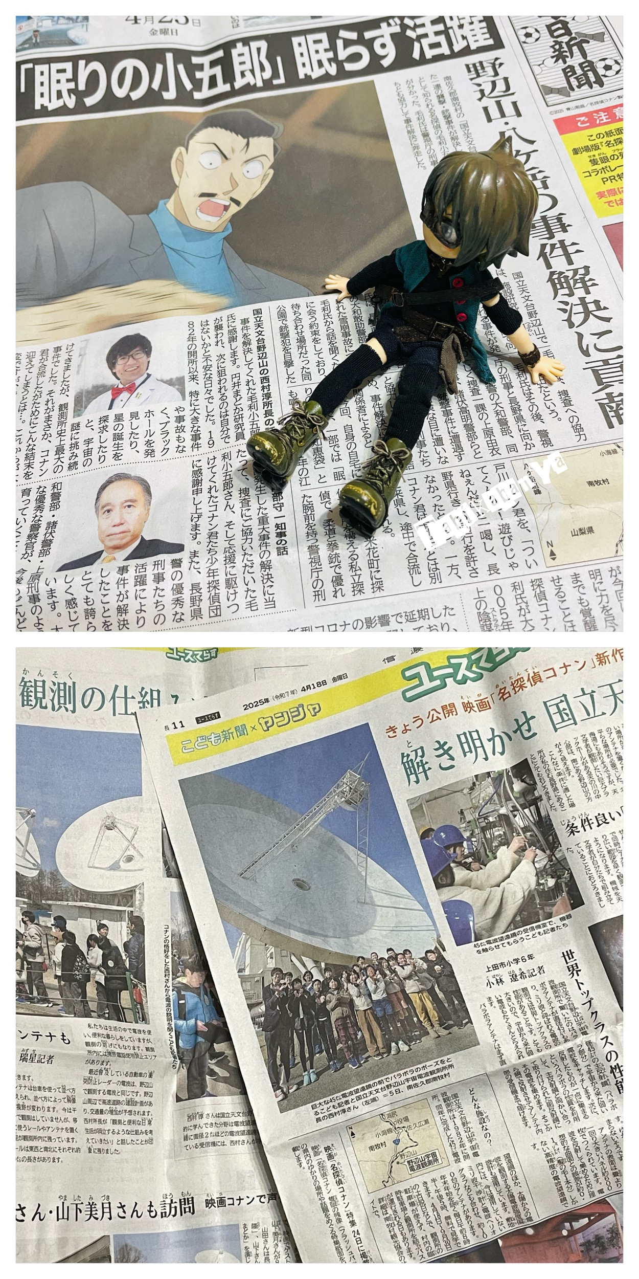 家族でニトリに買い物行こうぜ!と出かけたはずが思いのほかあっさり買い終わってしまいじゃあ飯でも食って帰ろうか〜 と 目当ての店に行ってみたらそうさ この日はこどもの日でそこらじゅう大混雑じゃあ ちょっと時間をずらして食事にしよう、天気もいいしちょっとドライブでも行こう…ということで何故か急に野辺山の天文台に行くことに決まった。行こうと言い出したのは私ではない。むしろコナン映画の聖地巡りできっと混んでるよ、と止めたくらいだ。だが行くことになった。道中、飲み物買ってくか と立ち寄ったセブンでコナンのスタンプラリー集めたりコラボおにぎり買ったりそれはもう 側から見たらコナン大好き一家のように野辺山に向かったよ。(因みに私以外の家族はコナンほとんど見たことないんだ)この日、天文台の駐車場は制限されていて入場できず、ちょっと離れた臨時駐車場に停めることになった。しかし天気がいいし気候も丁度良く散歩がてら歩くのが気持ちよかった。まず情報館でお土産見たり屋上まで上がって全体の景色を眺めた後観測所の45mのアンテナを見にゆく。結構歩くが、気にならないくらいの不思議な面白さがある。結構人が来ていたが、敷地も広いのでぎゅうぎゅうということはない。有料で見学コースもあって、申し込めば説明を受けたりアンテナ移動車の側まで行けて写真を撮れたりもする。45メートルの大きさが写真で伝わらないのがもどかしい本当にスッゲーでっかい。写真にはうっすら人も写っているので比べるとその大きさがわかるがでもやはりそばまで行った時の臨場感は半端ない。プラネタリウムでは特別上映で「閃光の宇宙船」というのが見れるらしかったが時間が合わず(また私以外は見たそうではなかったため)断念した。信毎のこんな新聞飾ってあったんだが知らなかった。欲しい。売ってください。グッズはこんなのとか、後去年函館で見た感じのものとかがありました。限定品としてはアクリルキーホルダーとか、この写真に写ってる丸山珈琲コラボドリップコーヒーとか。あと、感動したのがパトカー来てたこと。「長野県警」!!なんでパトカー居るのかなー と思ってたらドアにあのぬいぐるみが挟まっててサービスで来てくれているのだとわかりました。ウソでしょ そんなことある?こどもの日だから?協力的過ぎるやろ…!記念に写真撮り放題。この写真では写していないがそばに警察の方2名居て、お願いされたら親子さんと一緒にポーズ取ってパトカーの前で写真撮らせてくれたりしていて さらに凄いなと思った。協力的過ぎるやろ…!個人的には土産はこのガチャ1つに留めました。意外とすごく楽しめてしまった。こうなったら劇場まで行って、映画見てからまた来たい勢いだ。とりあえず映画だけは観に行こうと思う。HOME
