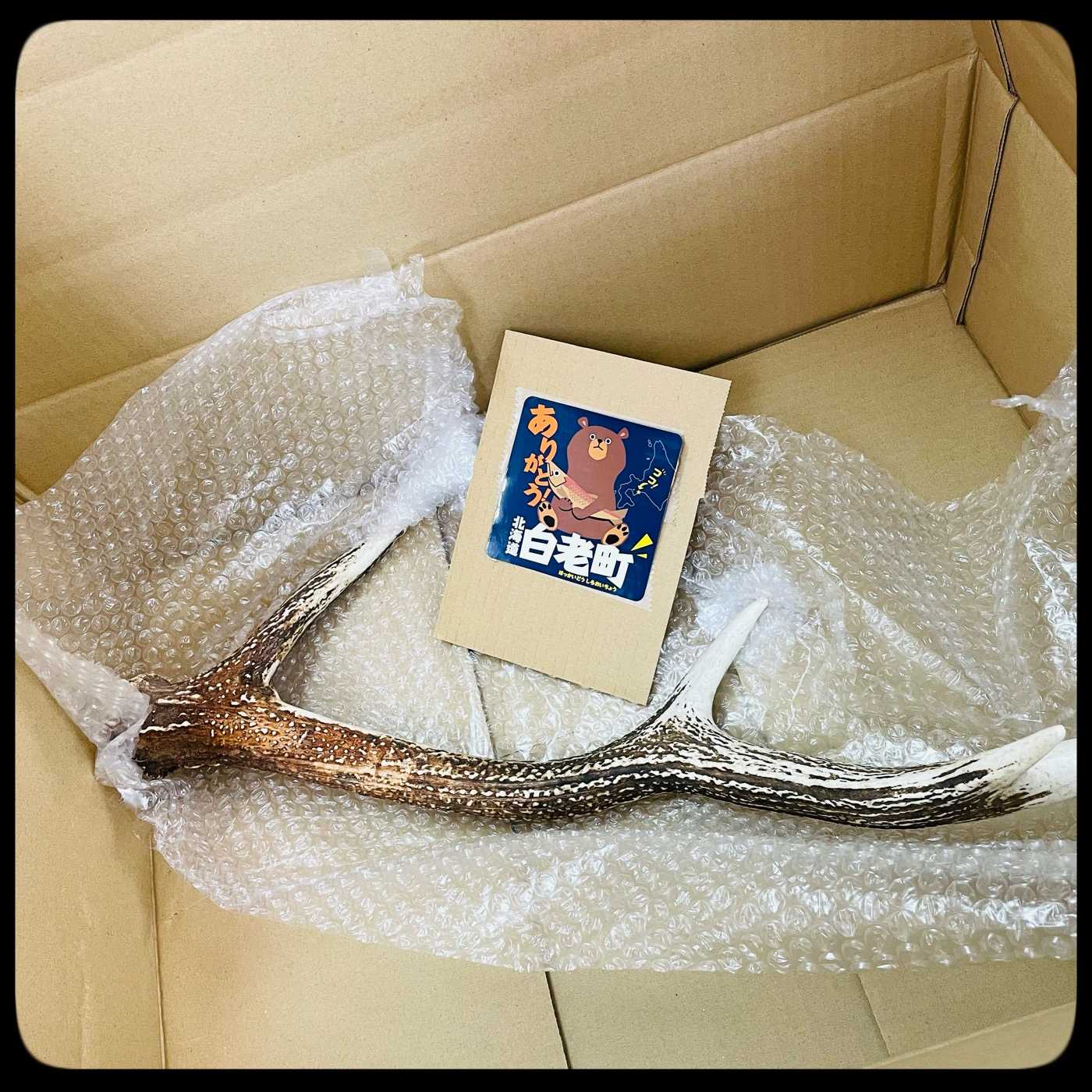 今年のふるさと納税では伊勢うどんとワインとシカツノをもらった鹿の角、というか頭蓋骨は知り合いのマタギの人に貰ったので自宅にあるんだけど、でもこれはエゾシカなんだ!蝦夷鹿の角は持ってない!と興奮して直ぐに申し込んだ。1週間もしないうちに本物がやってきてその大きさに驚く。私が持ってるのより大きいんだが、本体の鹿の大きさはいかほどか。箱には「白老町」のシールまで貼られていて「場所は知ってる…!2回ほど通った…!」とすでに知ってる町のような感覚を覚えています。いつか白老にあるウポポイに行きたい。過去2度旅に組み込みたくて計画したのにまだ行けてないのだった。行くならしっかり時間を取って、ちゃんと回りたいんだよね。HOME