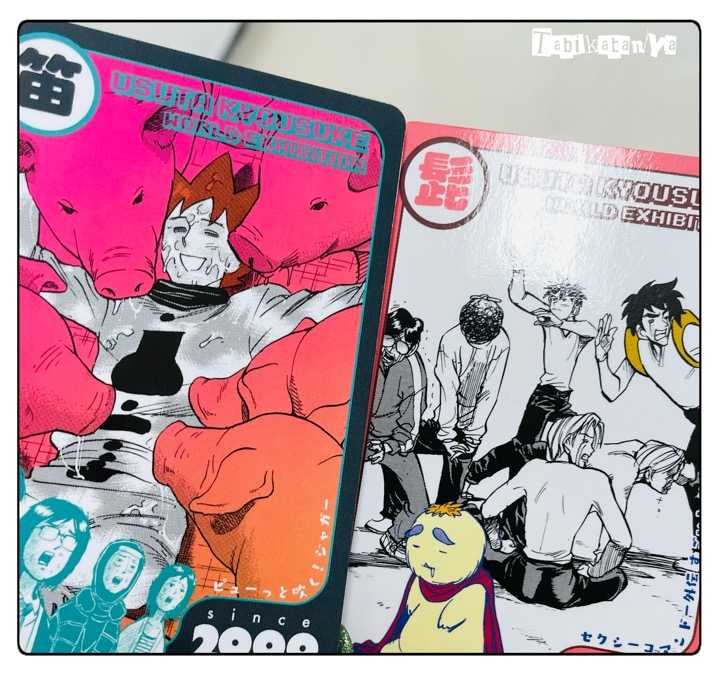 友達と「うすた京介ワールド展」行ってきました。ジャンプラでへっぽこ読んで俄然行きたくなってしまった展示、まさか本当に行けるとは感無量ですよ。友達がマサルさんで、私はジャガーが入場特典。どっちもイイですね。展示は最高でしたし なんというか この世界観を共有する見知らぬ人たちが全員この空間を同じように懐かしみ、楽しんでいるのが最高でした。全員仲間…!という雰囲気。同じところで笑ってきた時代の仲間たち集結。マサルさん、ジャガーは特に原稿がアナログでトーン跡や指定がそのまま残っているところも興味深くカラー絵も原画は塗りの経緯まで感じられてとても良かったです。「ボールペンで描きました」的なコメントがあり新事実を知ってしまう楽しさ、「眠りながら描いてました」的なコメントがあり週刊連載の厳しさを知る恐ろしさ。うっすらしていた武士沢レシーブの最終回がどうだったのか思い出したり、同時にコメントを読んで「そうだったのか!」と思ったり(コミックスを持っているのに簡単に取り出せないところに仕舞ってある今はすごく通しで読みたい衝動に駆られている)「そぉい‼︎」に関しては友人のすっごいカッコいいそぉい写真撮れたので言うことなしなんですがご覧の通り躍動感のある写真が撮れるのは上のアングルですが文字が全部撮れるのは下のアングルという ちょっとしたジレンマがありますことを最終日に行かれる方々にご連絡差し上げます。結論、どちらも良いですよね。立体物の素晴らしさよ。ジャガーさんの「がっかりイリュージョン」はみんなとても楽しんでいたのが印象的。逆に期待通りでガッカリしない。ニヤニヤしてしまう。このピヨひこ堂はシュールで殺伐としたアングルで撮れた。珍笛もひとつ一緒に写っております。グッズはxで見ていた通り、結構品切れがあり狙っていたキャップは売り切れで再入荷もなく残念でしたがそれでも会場内で何買おう、とウロウロするのが楽しく、同志は何を買っているのか見ているのも楽しかった。ヨロシク仮面のマスク(複数枚)や武士沢ブレード買う人もいて会場内で「どこに飾るんだろ…フフ」と恐らくフーミンのような笑顔で見ていたと思われます。子供連れで来ていて、その子が「高いね!」と言ったグッズを迷わず次々と購入していくきっぷの良いお母さんも居て、カッコよかった。私の会場戦利品はこちら。購入特典のクリーナーは一緒に行った友達がくれました。大事に拭くね。コレに関しては飾らずむしろ使っていこう。ヒゲカラビナ、購入制限なかったら来ていない友人の分も買いたかった…!ボスケテキャップは事前に品切れがわかっていたので「チックショー!」と思いつつ自作しました。刺繍のとこだけ。布バッヂとして服に付けていきました。これはこれで気に入ったので怪我の功名。ただ、ボとスのヒゲっぽいシルエットが再現できていないのでリテイク予定です。あと前日に発掘された数々のうすたグッズの写真も記念に載せておきます。2003年の日めくりカレンダーとか。なんで使わなかったのかは側面を見て思い出しました。崩したくなかったんだな。同じ理由で、めくることさえしていない。2個買うべきだったやつ。ポケットティッシュは当時どこかのゲーセン前でもらったものだと思います。メソの小さいキーホルダー、どこに仕舞ったかなぁ と思ってたがカレンダーなどうすたグッズで固めて一緒に箱に入ってた、よかった。歴史のある作品を振り返るのは自分の過去とも会えるので楽しいものですね。そんなうすた京介ワールド展、本日(8/31)最終日!次は大阪会場!迷っている方は是非!行った方がいいです!HOME