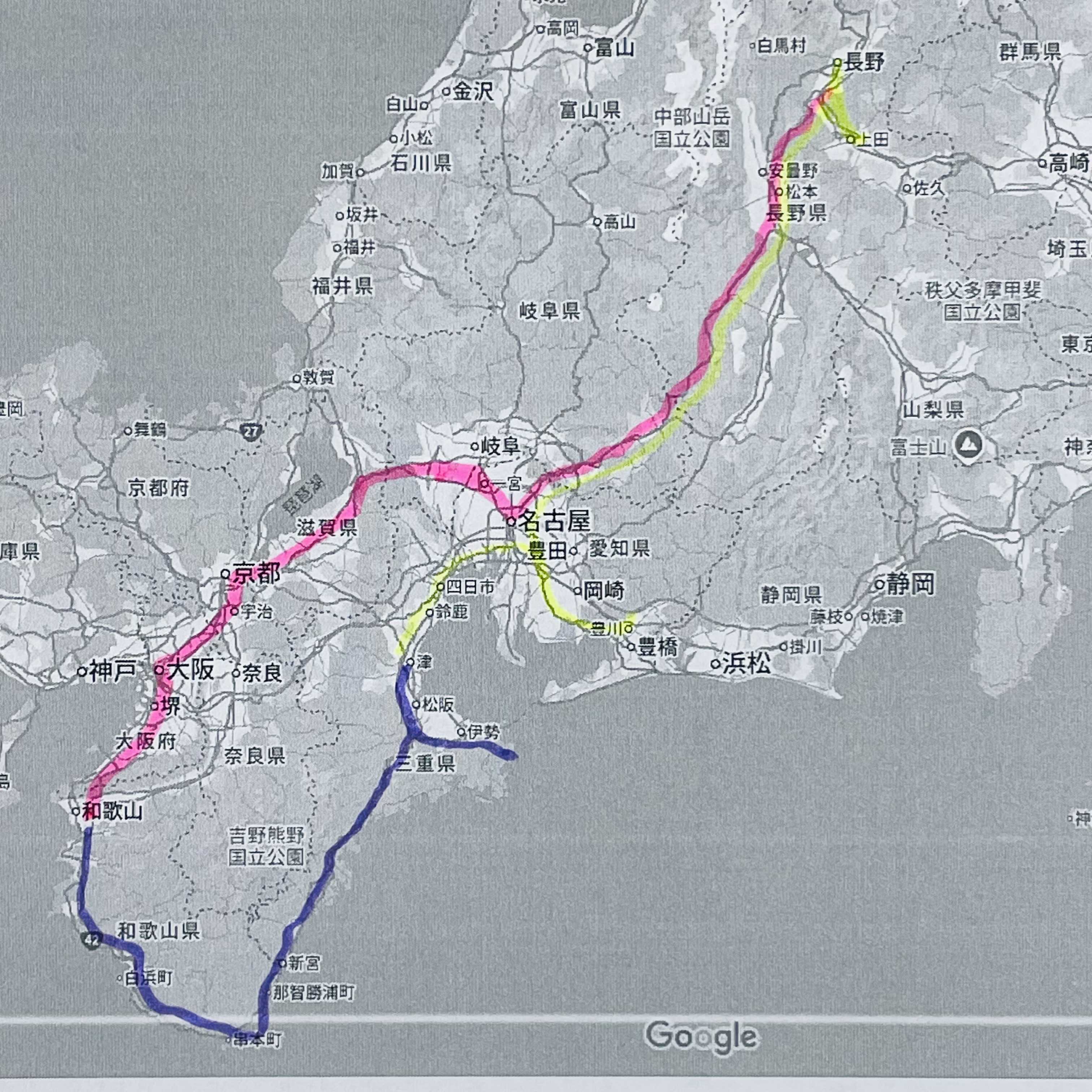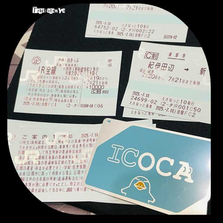 前日譚はまた別に書くとして。急に思い立って計画して、出かけることになった三連休の旅の記録。青春18切符と特急列車を使って、長野から和歌山、紀伊半島を回って伊勢市、そして愛知に行ってまた長野に帰る、そんなスケジュール。地図上で見るとこんな感じ。ピンクが1日目、紫が2日目で、黄色が(見えにくいが)3日目。勢い余って若干違うところに線を引いてる部分もあるが、大体こう。上田は新幹線以外のJRが走ってないので、青春18でスタートするために篠ノ井駅へ。しな鉄で乗り換えると時間が合わなすぎなので、車で送ってもらった。では、いざ ローカル線の旅へ。この日の出発時間は6:44。夏の青春18切符使用開始日だったのでもうちょっと人がいるかと思ったが意外と同志は少ない様子。車内は空いてた。朝日を浴びた 見慣れぬ景色きれいだな…けど 今日は乗り換えが多くて景色を楽しむ余裕あるかなジョルダン先生とGoogleに頼ってあとはえきねっとで確認した旅程だが大丈夫なんだよな…? とこの時もまだ思っていた。今から20年以上前に一度青春18切符の旅やったことあるけどその時は細切れに使えたので一気に3日分算出しなくてよかったしそんなに複雑な旅でもなかったから時刻表でなんとかなったんだな。姨捨でスイッチバックして、まだまだ山道を行く。この路線、篠ノ井ー名古屋間は通常であれば特急しなので向かう道。貴重な山間鉄道で、これが無ければ列車で名古屋に出るには東京周りで行くしかない。長野(特に北信)から関西方面は、こういった理由で移動がなかなか困難です。しかし特急しなのですら普通に3時間かかるルートで、今回は倍の6時間かけて名古屋まで行きます。行きの乗り換え駅は 塩尻・中津川。塩尻で乗り換えたら山登りの方々がたくさん乗ってた。そしてその方々は南木曽で降りていったとさその後車内はまたスカスカに。次は中津川で乗り換え当駅始発の列車なので気楽。名古屋までの列車はロングシートで、賑やかな街に向かう感じを醸し出してた。ところで車内驚くほど寒いんだ長距離乗る人には寒いくらいの温度設定なのかもしれんね次があったらストール用意しようと思った次第。さて名古屋到着は12時過ぎ。ああ やっと名古屋着いた!と張り切って一度改札外に出て弁当屋など見てみたがちょうど昼時でレジが激混みだった為購入は控えたこの日は色々 駅スタンプ押したり 初めての駅キョロキョロしたり次の列車も座りたかったり なんやかんやと色々忙しかったんだ。まあ 列車の混み具合は杞憂に終わり 次のも余裕で座れた米原で乗り換え。この日は本当に乗り換えだけで終わっていく予定。乗り鉄ってわけじゃないけど、それでもこうして各駅を乗り継ぐ旅は結構楽しい。その後大きい川渡ったな、と思ったものが地図で確認したら琵琶湖の終わりだったと知って驚く。とにかく天気がものすごく良く誰もが思い描くような18切符日和だった。京都は通過、次は大阪で乗り換え。流石に大阪駅は混んでた…!乗り換えるだけで大混雑だった。その隙を縫って、売店でミャクミャクのステッカーをなんとか買う。どんどん南下しついに本日の目的地、和歌山に到着。着いた!今日はここで泊まる。この時点で16時54分。あー今日は1日中乗ってたなーしかし まだまだ終わらない急いで予約していた駅近ホテルに荷物を置きにいってさ、(選挙演説で駅前人だかりだった、走り抜けにくかった)すぐまた駅に戻って和歌山電鐵に乗る。たま電車!猫駅長たちの出勤時間は終わってるのでそこまで乗客居ないんじゃないか?と思ってたけど完全に読み違って 割と混んでた。通勤通学の人だけじゃなくちゃんと観光客もたくさん居た。早めに車内入れたのでこうやって写真撮れたけど出発間際は座席空いてないくらい混んでた。和歌山電鐵は列車のラッピングが色々あったのでひとまず最初はたま電車に乗りたくて、電鐵の時刻表読み込んで、この列車に合わせた。間に合って良かったよ。と思いつつ ごとごと揺られること35分、終着駅の貴志駅に到着したら全景撮ってスタンプ押してすぐ同じ列車に乗ってUターン。これを逃すと30分ここで何するわけでもなく待つことになるのでね。売店はなんと16時には閉まっちゃうそうなので…この日ここではもう何も出来なかった。たまタイル可愛かったな。これを売ってほしい。折り返し、次の駅は「甘露寺前」↓甘露寺蜜璃カラーになってると聞いたのでぜひ写真撮りたいと思ってた。撮れてよかった。(一度降りて撮って、またすぐ乗った)そして次は「伊太祁曽駅」で下車下車ついでに乗っていた電車の横顔を撮りまくる。向かいに来てた「うめ電車」も撮る。ここも駅長の出勤時間は終わってるけどもしかしたらグッズはまだ売ってるかもと思ったんだが販売終了してた。完全に説明不足だったため 補足しますたま駅長の跡を継いで、今は「にたま」「さんたま」ちゃんたちが駅に出勤してるそうなんだ。その出勤してる駅が「貴志駅」