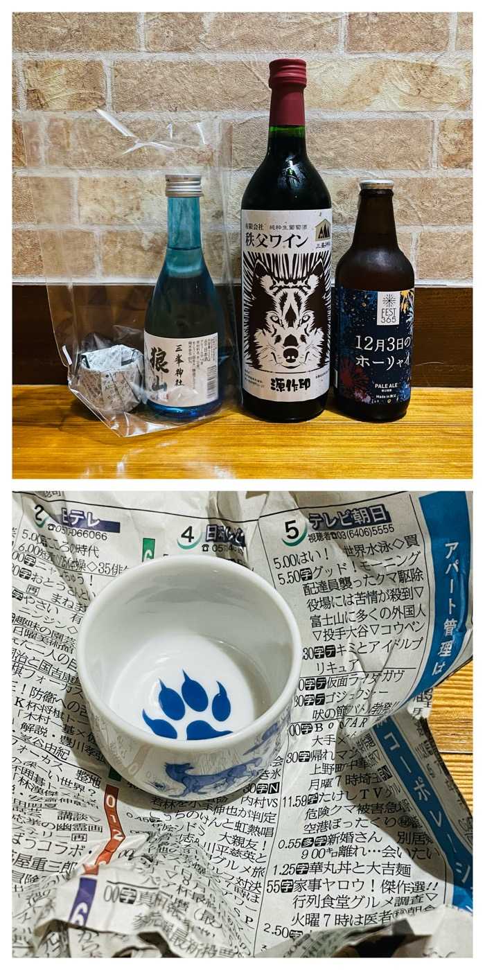 とりあえず酒は買いました。一緒に入っていたお猪口の中が足跡なのが可愛すぎる。社務所を通り過ぎた先にあるお店で買ったのですがそこはやけにオオカミラベルの酒が多いな、と思ったら後でレシート見て納得。酒屋でした。Tシャツとかお菓子とか様々なものを売っていたので酒屋ベースとは思わなかった。ちなみにオオカミのぬいぐるみ、ここで売ってました。大きいのから小さいのまで。私は1番小さいのを購入。ぬいぐるみのタグがちゃんと三峰神社だったのが嬉しい。張り子のオオカミが可愛ったらないね!2セット買って、ワンセットは叔母の元へ(↑彼ら)自分用には1人だけ銀色のヒゲのない子がいたのでその子を連れて帰ることにする。エラー品カテゴリなんだろうけど、そういうのに愛着が湧いてしまう性質で。HOME