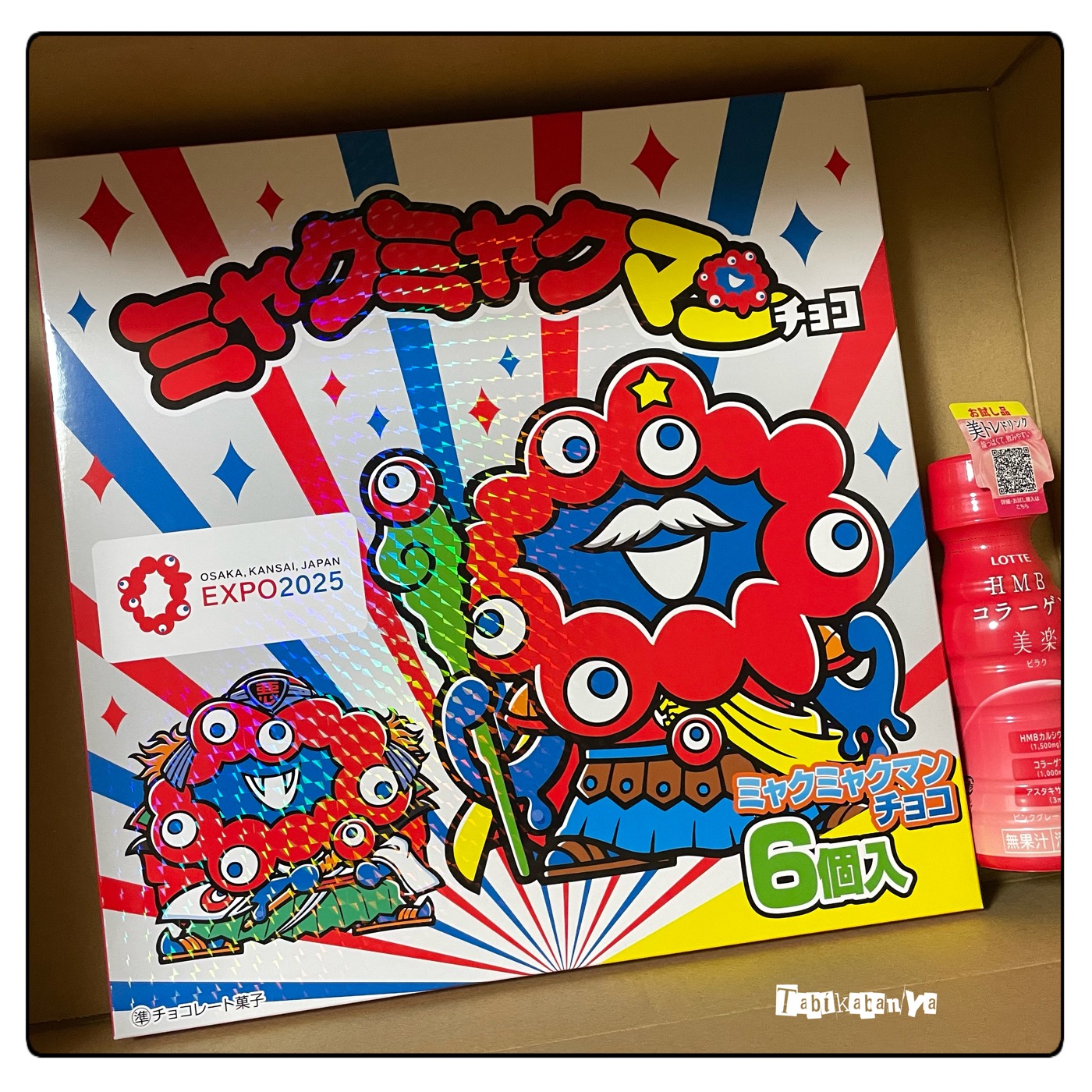 ロッテさんはまた面白いものを作ってしまったのだね。私の知らないうちに。EXPO記念でミャクミャクマンだって…⁉︎知ってしまったからには欲しい。しかし発売が1ヶ月も前でかなり出遅れてしまっていた。買えるのか?私はミャクミャクのこのビジュアルがなんだか知らんが好きなんだ。目は笑ってないのに口が笑ってるところとか。別に世間体など全く気にしてないよ風な雰囲気とか。なんか縁あって公式で買えて、届いた時の姿。いや、最初は無かったんだよ?購入ボタングレーになってて。(ある朝いつもより早く目覚めてなんやかんやでこの存在を知ってロッテHPに飛んだら売り切れになっててじゃあ楽天市場とかAmazonで売ってるのかと探したらアホみたいな値段でこんなの買えんわ と元の公式に戻ったら何故か販売ボタン復活してて「?買えるの?」ってなりながら購入したという経緯が)ちなみにその日の夕方見たら「購入できない商品」に変わっていてあの瞬間何だったんだといまだに思うがとにかく公式で買った。良かった。ミャクミャクマンの箱は思っていたよりずっと薄くて縦横26センチ角、厚さ3センチ弱のギフトボックスみたいな箱だった。これがロッテの茶色いダンボールに入れられ、パッキンで詰められ、おまけに試供品のドリンクが一個入ってた。本体1680円、+クール便の送料1100円で高いなぁと思っていたがこれ一個で懐柔。(オマケウレシイ)さあ 自宅で開封だ!綺麗に並んでいるが やっぱりギュッと詰まっていないからか開封しててチョコとウエハースの崩れが目立ったな。ヤマト爆神もどきが出たら開けるのをやめようと思っていたが最後の一個だったので結局全て開けてしまった。いや どっちにしろ開けるのをやめる、とか多分無理だったけど。ヘラクライスト出た時ちょっと驚いた、「ヘラクライスト。 えっ ヘラクライスト⁉︎」その他はミャクミャクがコスプレしてますって感じだったのにこれだけまんまと寄生されてて しかも気づいてない雰囲気。怖い。けど1番面白い。全10種のうちどれが出ても良かったが爆神は入ってて欲しかったのでこのラインナップは良かった。何気にシークレット2種入ってたけど個人的には何かのキャラとビックリマンキャラが並んで立ってるだけのやつあまりコラボ感無いなと思ってて。共闘してくれないと。シールの中の世界が膨らまないところが多分好きじゃ無い。だがしかしかくして、私のEXPOはこれにて多分終了。好きな感じのミャクミャクグッズが手元に残って、それは嬉しい。HOME