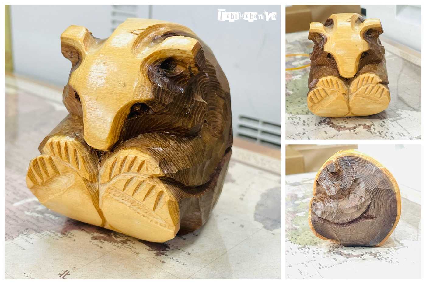 木彫りの熊については数年前から注目していてここ数年は北海道に行ける機会が多かったので行く度、目につくたびに現地の熊の木彫りなど購入していたのだが近すぎて見えていなかった熊をご紹介します。今日叔母に「棚のもの、何か好きなのあったら持っていっていいよ」と言われ初めてのような気持ちで眺めたその棚にあったのが「どんころ熊」背中を丸めて小さく丸まった姿勢。よく見ると年輪が熊の腕側にある、白い部分と黒い部分を上手に使った木彫りだった。すごいな。うん、凄いし、造形が凄すぎないか?シンプルに美しい上に あれ?見れば見るほどかわいいな?大きさは大きいおにぎりほど、8センチくらいの木塊の熊である。これもらってもいい?いいよ、ともらったそれは元々叔母の父のもので彼は生前旅先でこういった民芸品を買い求めるのが好きだった模様。その棚は私もよく目にしていたのだが「人のもの」と言う認識だったので今までじっくり見ていなかった。こんなかわいい熊が居たのか…!人って本当、意識する前から見えていたものってよく見てない可能性あって怖い。日常バイアスかかってる。しかし、台座が紛失していたので最初はこれがなんなのかわからず、作者印もサインもなかったため背中に貼ってあったシールから辿って判明した。(台座があればそこに「どんころ熊」って書いてあったらしい)そしてびっくりした。どんころ熊は今から50年ほど前に北海道の足寄町で生まれた熊だったのだ。足寄町といえば松山千春。松山千春といえばうちの母。コレは母が喜ぶぞッ!さらに調べると今から20年ほど前には木彫りの熊ブームが終わってしまい生産が途絶えてしまったそうだ。昨今になりこの熊を途絶えさせてはいけないとまた復活の兆しを見せているとのことだが今ここにあるこの熊は間違いなくその当時のもの。多分松山千春と同じ時代に足寄町にあったもの。感慨深い…案の定 母、超喜んでおりました。喜んで直ぐ自室に飾っておりました。ちなみに「どんころ」とは丸太のことらしい。使っている木は槐で、とても硬くて加工は大変なんだとか。どなたの作か分かりませんが、後生大事にします。北海道の熊の木彫りはどれを見ても自然への畏れと親愛に溢れておりそこに道民魂が垣間見えるような気がしてとても好きなんだ。HOME