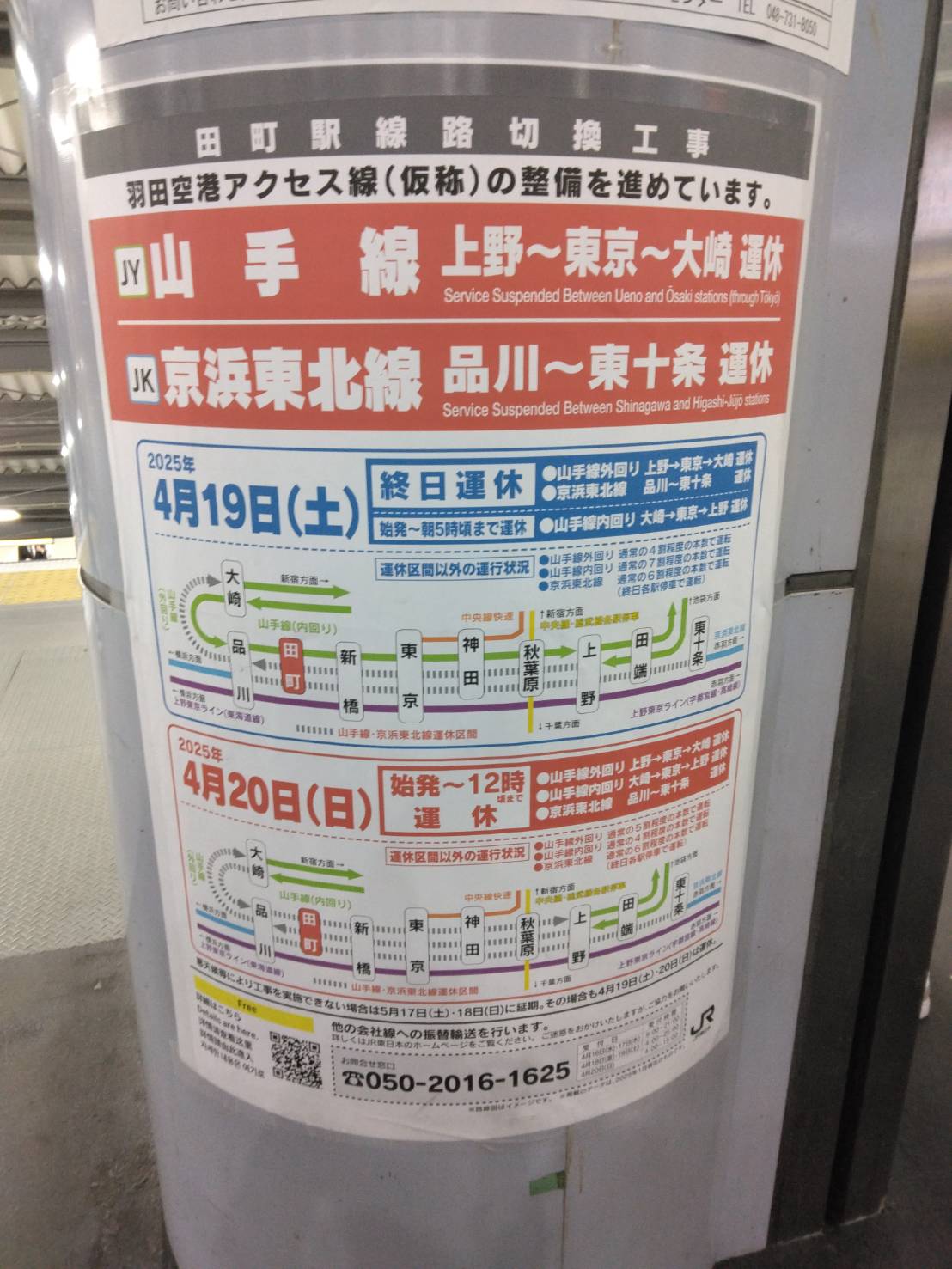 トライス:さて、普段利用する機会の多い路線が、地震や天候がらみ以外で事前に長時間の運転見合わせが決まっていると、結構大変だよね。最近は、特に大雨が予想されるときの計画運休も、目につくようになってきたからね。もちろん、人身事故での レム:たとえば、ストライキとか? トライス:あ~、そっちに行っちゃったか。確かに、ストライキも急な、そして長時間の運転見合わせになりやすいよね。ちなみに、ダイスによるカンペによると、直近の日本の大手私鉄でのストライキは、2014年3月20日の始発から6時半くらいまであった、相鉄ホールディングス、相模鉄道、相鉄バスの3社の労働組合によって行われたものみたいだね。その日は、7時以降に電車やバスでは順次運行を再開したというか、開始していったみたいだけど、約6万人に影響が出たみたい。 レム:結構影響が出たんだな・・・。 トライス:まあ、ストライキは取引客、今回の場合は乗客に大きな影響が出かねないから、労働者側は影響の大きいところを通告するだろうからね。一方の、経営者側はそうならないよう、考え直すように相手を説得できる方法に動かないといけないだろうし。たとえ数時間とはいえ、鉄道やバスが止まれば、これくらいの影響が出るのは容易にわかるのだろうけどね。・・・って、違うよ? レム:じゃあ、なんなんだ? トライス:それは、今日の4月19日から明日の20日まで続く、JR東の一部路線で続く運休の話だね。 千里:そうですね。本日4月19日の話題となります。羽田空港と都心を結ぶ「羽田空港アクセス線」(仮称)の整備に伴い、JR東日本・山手線・京浜東北根岸線の田町駅で線路の切り換え工事を行うことから、山手線・京浜東北根岸線の田町駅を含む一部区間で19日に終日運転を見合わせます。山手線では、外回りで上野駅→東京駅→品川駅→大崎駅間、京浜東北根岸線では、東十条駅~田端駅~上野駅~東京駅~品川駅間で、いずれも終日運休となります。なお、明日20日も一部区間では始発から正午ごろまで一部区間で運休となりますので、お出かけの方は十分ご注意くださいませ。※1 レム:結構大規模な運休区間だな・・・。でも、運休の範囲が広くない? 数希:折り返しができる区間を考えると、こうなるんだろうね。山手線の大崎駅は車両基地があるし、京浜東北根岸線の東十条駅も、普段からここ行きの電車が設定されているからね。 トライス:当日になって、駅まで来て初めて運休を知って困ったって文句を言うやつがいるだろうけど、普段から山手線や京浜東北根岸線に乗っている人なら、ポスターを嫌というほど目にしているはずだからね。そういう人に限って、スマホしか見ていないんだろうから。少しは周りの景色でも見ればいいのにって言いたいよね。 【・・・本日19日と明日の20日で、約54万6000人に影響が出る見込みとのことですね。】