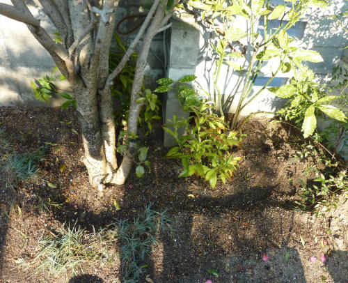 こんばんはまた冷え込みましたねぇ明日の朝はすこぶる寒いみたいです今日はゴソゴソして買い物行って午後からは仕事をしてましたちょっとだけ~。。。 一応花ネタ探したけれどなかったのでコレ 葉っぱが展開始めた挿し木のバラ勝手に淳かブライダルピンクダグは付けてるけれどどっちか忘れたけど石灰硫黄・・・の皮膜は出来てます でこの前からの続き月曜日(建国記念日)の朝の作業 石の奥の方もどうにかしたいってことでルリマツリを移植しましたがその後も悩んでましたで何度か登場しているこのアオキさん なくなったら石の周りがすっきりして良いなぁと考えた!そう考えるとあれもこれも邪魔か!?なので赤い千両を引っこ抜いて アオキさんを移植しましたで赤い千両はどこへ~!と考えたらこの前移植したルリマツリが邪魔なので再びルリマツリを引っこ抜いてそこへ 赤い千両を植え付けましたでよ~く見回すと黄色い千両の位置が悪いなので 黄色い千両も少し移動させましたとSA!で石の周りはスッキリと。。。 再度抜いてしまったルリマツリは石の横に植え付けておきましたYO! 千両2本を移動させたのはキンモクセイの下ですが少し土も盛り上げておきましたよっ!千両役者・・・!ワ~ワ~! 再び正面からみるとこんな感じ スッキリしたねぇ! さてこの後どうするか?って考えながらホムセンへ行ったのであった~つづく。。。。 ふ~~~~