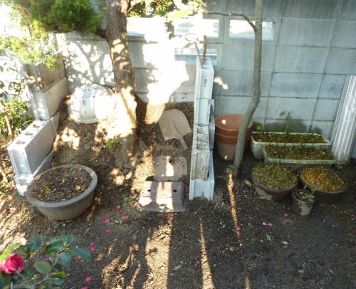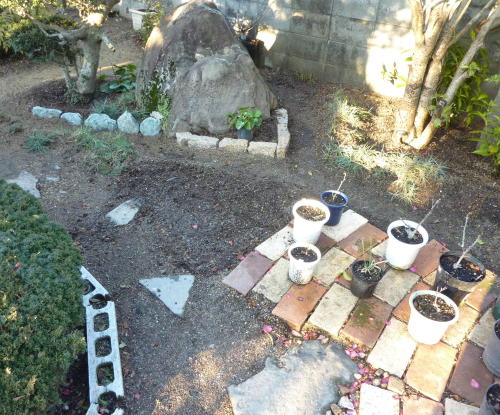 こんばんは今日の朝も冷えましたけど暖かくなっていつの間にやら雨はぁふるぅ~~♪ 先週あたりからやっている作業 古い土置き場を綺麗にしてます15センチと12センチのブロックで土台をしっかりとさせレベルも合わせて積みましたけど上のブロックが10センチなので不安定でありましたなので土曜日に買ってきて日曜日に積み直しました 少し安定しましたYO!でもねいつ気が変わるか分からないのでセメント類では固めません崩れてもたいした物がないのでこのままに一応レベルをとりましたので板をおいて作業台にしたり挿し木を置こうかな?と。。で挿し木と言えば隣に置いてますサッキ カラ ミエテ マスケド。。。 去年の夏以降のは成功してるのもチラホラあるみたい葉っぱも展開が始まってます 冬の剪定で出たのを挿したのは 芽が出て葉っぱが展開し出したように見えますが実際はまだでしょう持っている養分で動いただけカルスもまだだと。。。でも決して見てはいけないのDA!以前は見てたので失敗の連続でしてん。。。 で角度を変えて見てみると ギャーッ!すごいですねぇ剣山みたい。。。 いっぱいですねぇけどウチの場合は大丈夫成功率は低いので暖かくなるとほとんどが真っ黒に変わりますYO!で完成した土置き場あたりを撮ってみる サザンカと土置き場その向こうにレンガの鉢置き場とだるま石があります こうしてみるとなにかする?シナイ。。。 ふ~~~