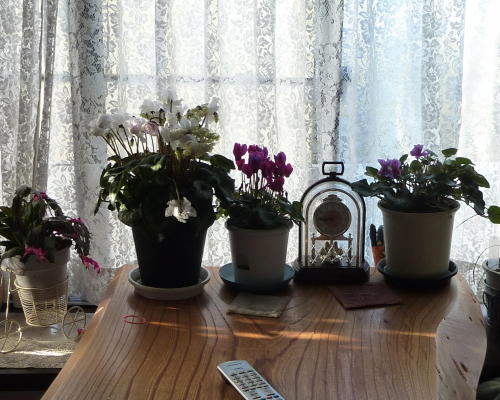 こんばんは少し暖かい朝でしたがだんだんと風が出てきてます明日の朝は久しぶりに寒SO~! この前は庭の「芽」組を紹介しましたのでその続き少し前の写真ですが。。。 シクラメンって、これは「は」組の人でしたね。。。正確には葉組み。。。 フリルブルーは少しずつ蕾を伸ばして咲いてます全体的には弱い感じです処分苗を買ったけど夏越組のようなので今年は夏越できるかな・・・・ 小さいのを安くかったショッキングピンクのも 大きくなっていっぱいさいてます少し古くなって紫色に変色したら綺麗だね~! ん~!良い感じ クリスマスにと買った フリフリさんは相変わらずの調子こんなものなのか調子悪いのか分からない・・・!?だんだん緑が多くなってきてる水の吸い上げが悪いのかも・・・? ピンクも混じるのでまあこれでも、ええか。。。。。 ちゃんと紹介してなかったカニシャボですが ソレナリに咲いてました一時水切れか?状態だったけれどとりあえず終焉を迎えようとしてますYO!で今のところ発病はしてません日数からすると明日の夜あたりかな?ゆっくりとした連休になるかも?ちゅーか強制的にゆっくりだNA! ふ~~~