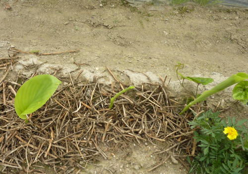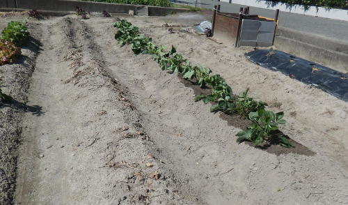 こんばんは雨は朝までには止んだけど雲は多めでした2日ほど晴れたら梅雨らしい天気になりそうだ。。。畑にて三つ目のランナーを取るためにイチゴを移植なんやかんや言うてイチゴの世話は1番大変かも・・?別なトコロに播いたツル無しインゲン熱そうなので乾き帽子の藁を置いた初期のインゲンは収穫が始まって今晩のおかずに出てましたサツマイモは無事定着したみたいでツルを伸ばし始めてますゴボウの葉っぱが大きくなったゴボウ自体は分からんけど試し掘りもええかもね・・?ピンクの花は分かりません収穫ラディッシュとブロッコリー初取りの茄子キュウリと大根だった。。。茄子は漬け物で食べたけどまだまだだなぁ。。。畑の南側では冬に買った柚子が実を付け始めましたもう少し大きくなって欲しかったけど展開と同時に花が咲けば仕方無し~~!枯れてしまった金柑でしたがこぼしてた種から発芽したみたいで植え付けておきました別の種類もあるので早いモンがっちになるかもねマルチはエンドウでっす。。。この前から出てきてるオホホ。。。今日はもう少し延びていますでメホホはまだかと覗いてみたらまだだった・・!覗いてスマソ。。。じゃ