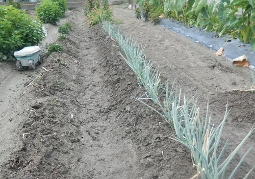 こんばんは朝は涼しめだったけど後はカンカン今日は室温も34度だ~!先週の週末良い天気で夏らしい空だった。。。その中で畑を鋤いた6畝2畝は半分ちょいですが。。。その後葉っぱ物の畝にはマルチを張ったブロッコリーの畝には再利用のマルチ使えるものはトコトン使おう・・!土曜日の酎のアテヤッコとチーズゼリーとヨーグルトイチジクだったイチジクは叔父さんから貰ったのであるチト味が薄かったかな・・?2つ貰って1つは残り誰も食べて無いなぁ鋤いたトコロに張っていたマルチは剥がしてイチゴとエンドウの予定地に張ったまだ気温は高いので消毒願います。。。土曜の最後にはラッキョとエシャロットを植え付け真ん中にはにんにくですがもう少し様子見です既に植え付けてたワケギは発芽しておりますラッキョは本日のトコロ発芽はしておりませんその日以来雨は降ってないし水も我慢しております収穫シシトウ・ピーマン・パプリカキュウリ・トマトでした今日も合間に作業と水やりしましたがあまりもの暑さに萎れた苗も幾つか・・!朝晩だけでも涼しくして欲しいなぁ。。。じゃ