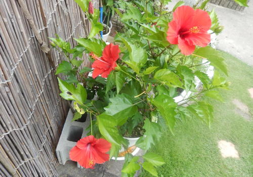 こんばんは午後から雲が多くなったけど良い天気からっとした暑さだった明日からはべとっとした暑さみたい雷雨もあるらしい。。ようやくハイビスカス地植えは2つ鉢植えは一つ目で写真撮れました咲いていたバラダービーミッドナイトブルー半分は夏顔ですクィーンエリザベスの挿し木畑にてまたまたキュウリを播きました地這い分ですマルチ押さえで目印。。。余ってたトウモロコシの種も播いて見た竹串で目印。。。最近オカンが畝の上を歩くので一度播いた場所を踏まれて撃沈・・!なので目印してますその前には一度目のトウモロコシの後に播種既に芽が出て大きくなり始めてます日曜の収穫キュウリ調子が良いときは1日4~5本です余りかえってる時もありますが適度に分散です台風襲来の前だったのでパプリカも採って見たまだ色づいて無いのもあるけれど台風対策でした思った大きさにはなってないけど。。。本日予告通り植木の剪定をやっつけた8時前からやって片付かず昼食後も頑張って終了エコパークに持ち込んで帰ってきたら3時だった。。。からっとした暑さだったけどヘトヘト今年の植木の剪定は終了で盆休みはバラの世話が出来そうです。。。じゃ