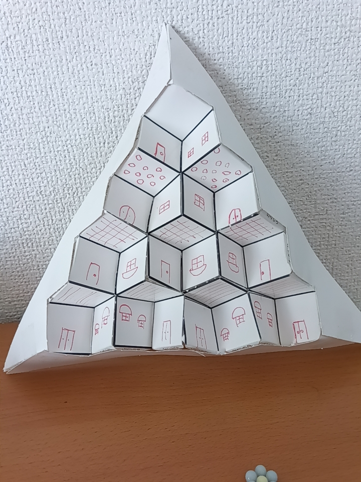 続いてトリックアート工作2つ目に取り組みました。こちらも悪戦苦闘しながらも完成までこぎつけました。家がたくさん並んでいるようで実際には凹んでいます。