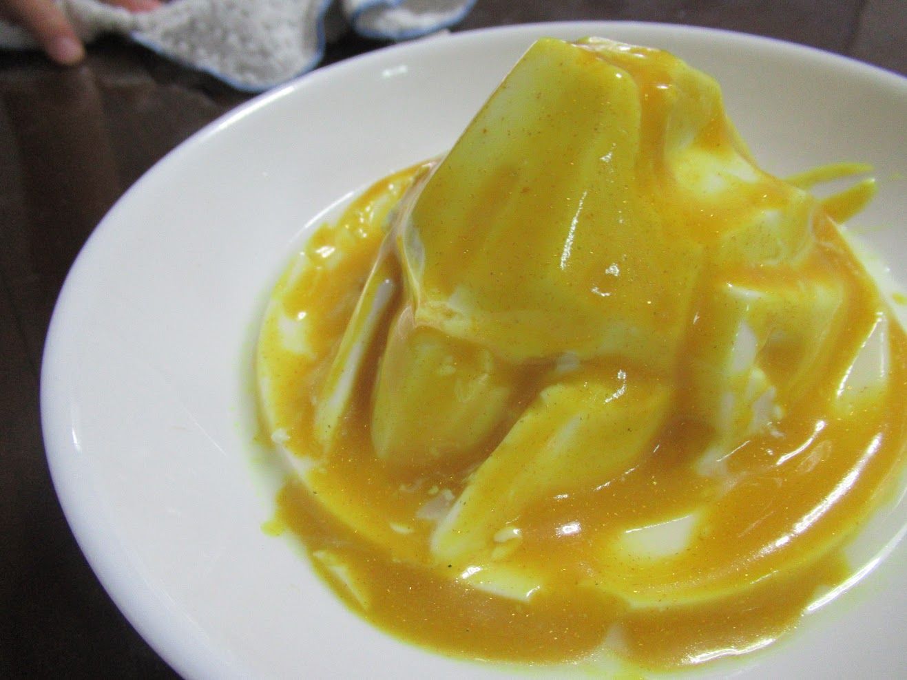 カレー風味のソースをかけます。金粉のような粉が混じっています。