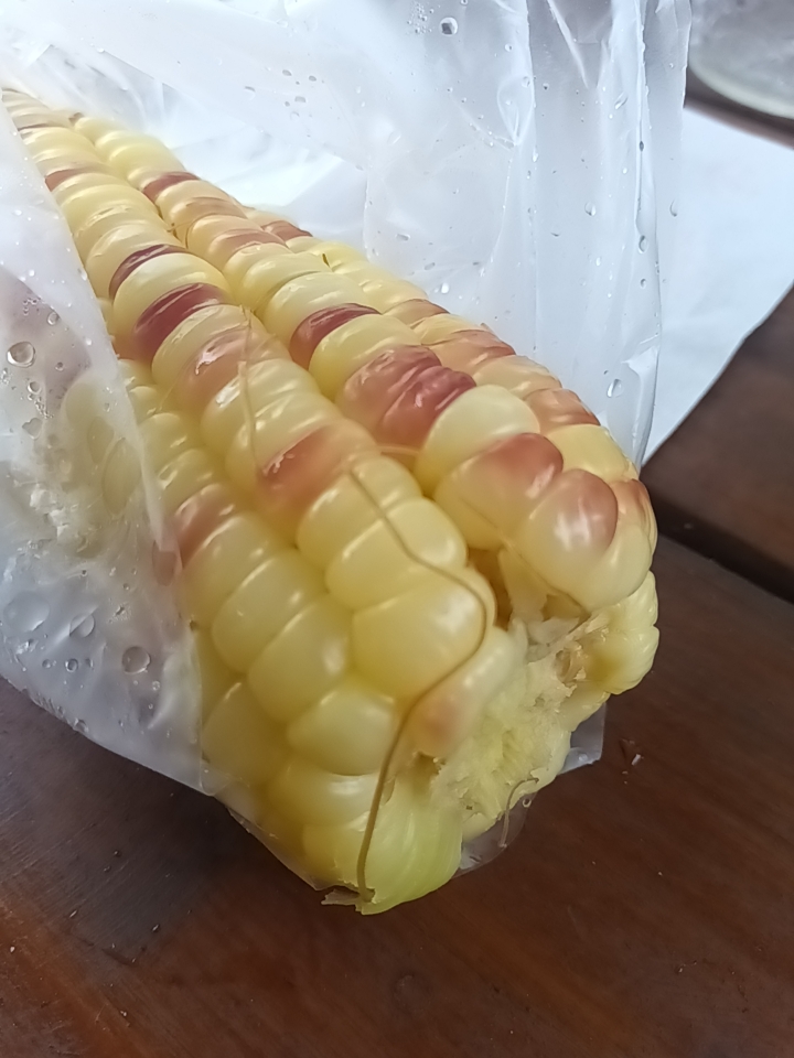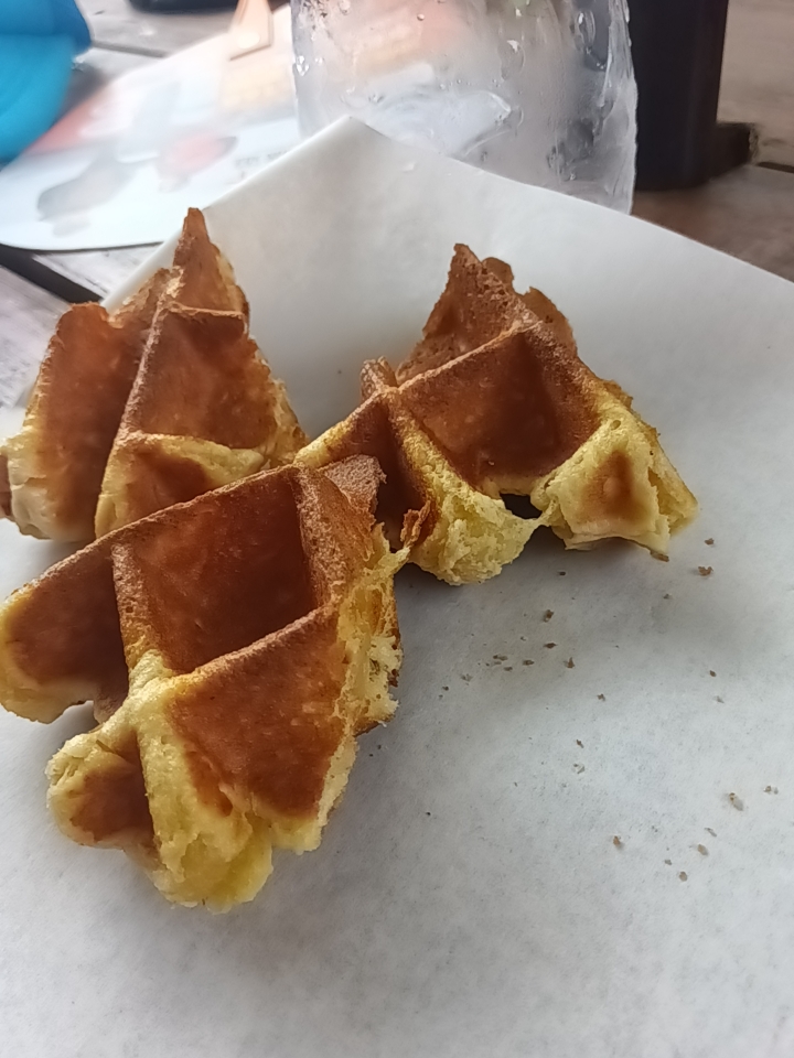 カフェで焙煎コーヒーをいただきながら,途中の顔なじみのお店で買ったトウモロコシとサービスのワッフルをいただきました。子どもにははちみつレモンをごちそうになりました。