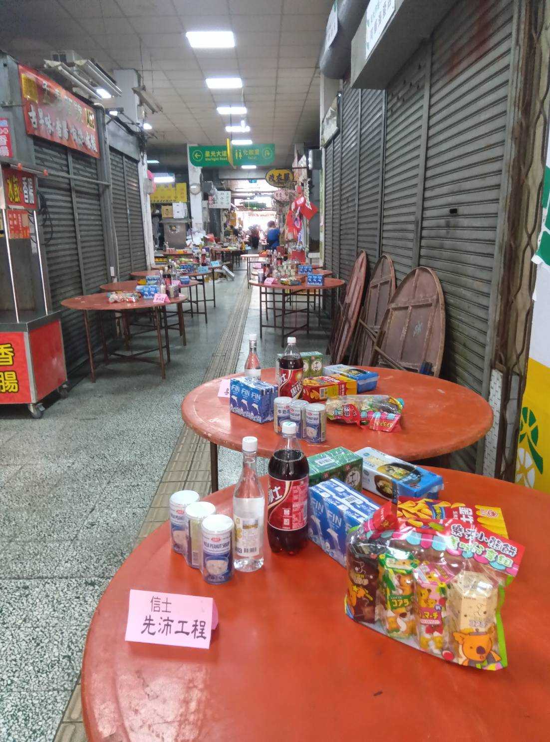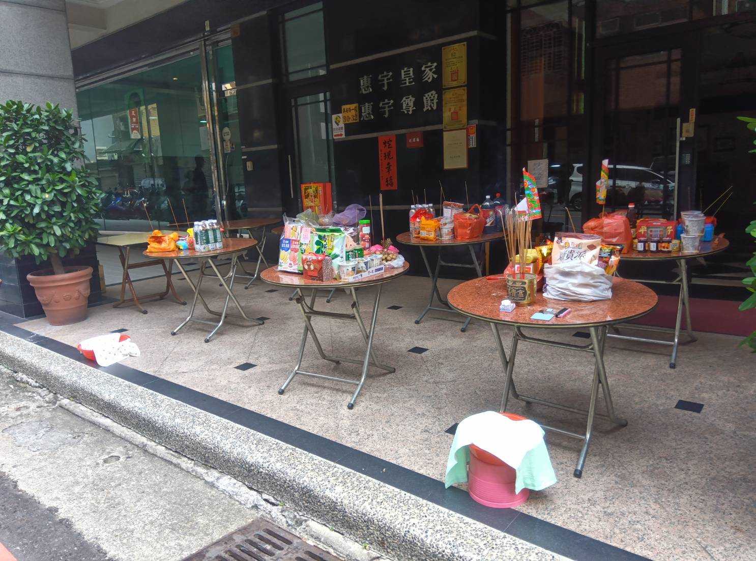 住民が持ち寄ったお供えをまとめて出してます。先祖の供養に対する信心深さがうかがえます。近所の通りも みんな こんな感じ金紙は後で燃やすために一斉に回収されたみたいです。市場も翌日はお休みでお供え物が並んでいたとのこと。