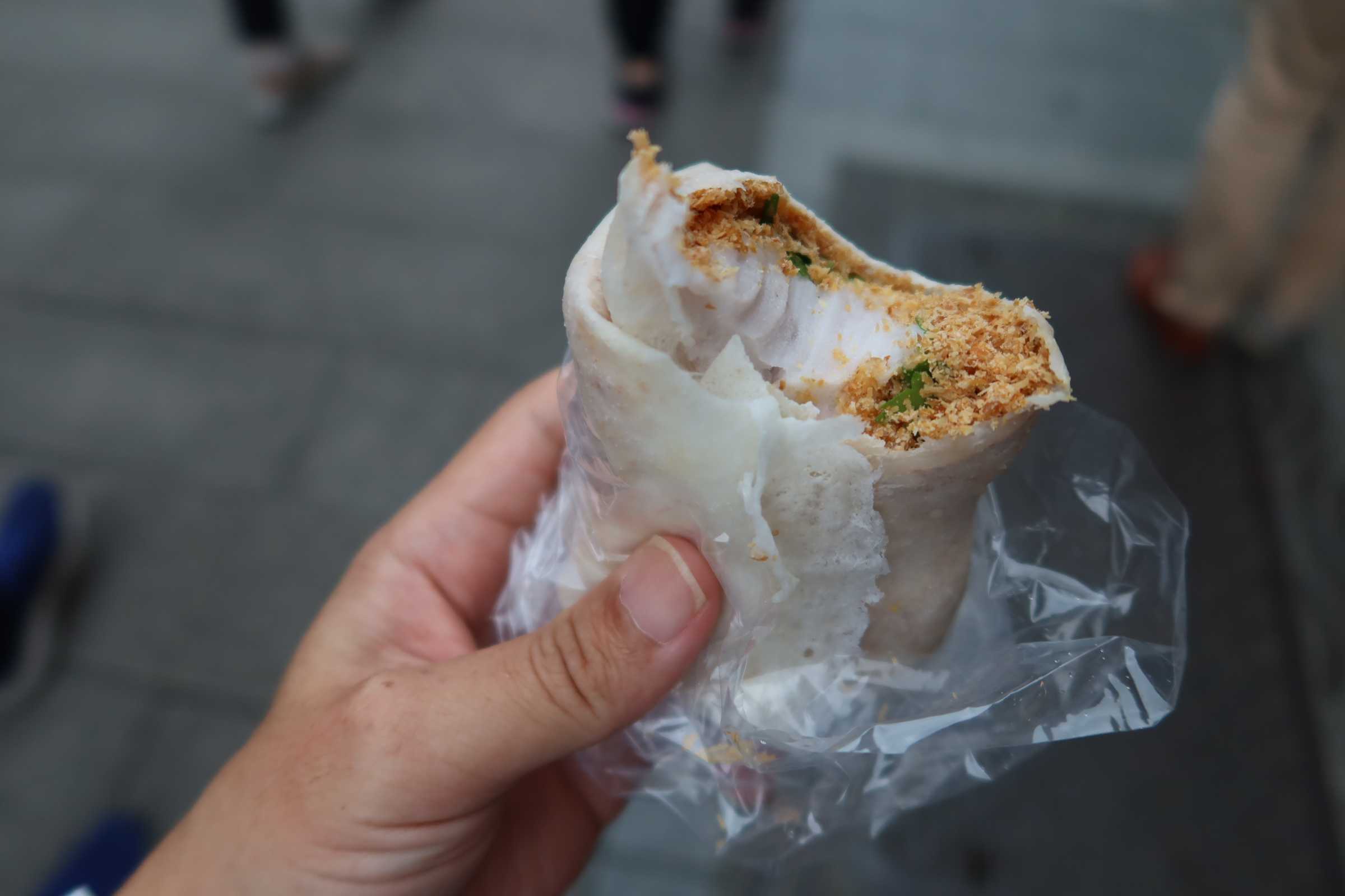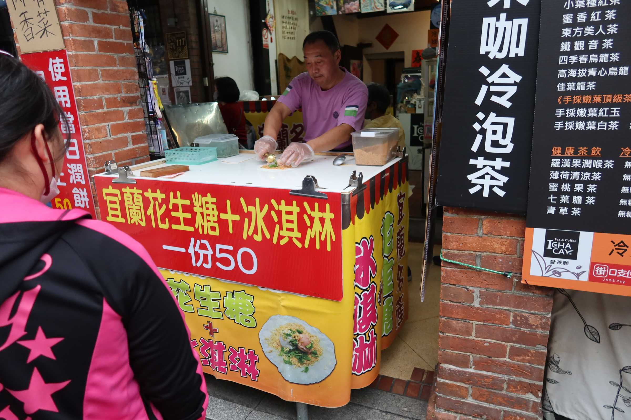 バスに揺られてお昼前に新北市の三峡老街に着きました。コンパクトに一つの通りだけが老街としての街並みを感じさせました。お昼を食べる場所も限られていて,端にあった牛肉麵屋さんへ。フロアのおばあさんは無愛想でしたが,味はまあまあでした。アイスをクレープで包んでココナッツの粉をかける不思議なスイーツに挑戦。香草が入っていて,不思議な味わいでした。