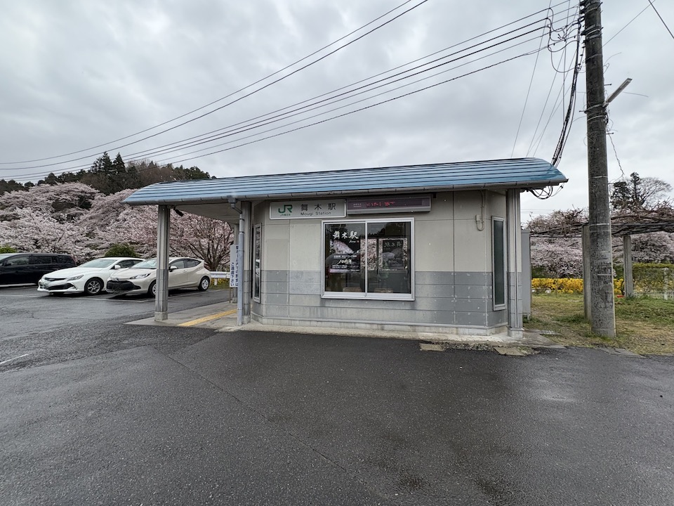福島県郡山市舞木町駅からハイキング悠久の歴史 里山に残る殿様街道を歩いてみよう参加者3名スタッフ5名約4kmコース小雨の中ハイキングです磐越東線舞木(もうぎ)駅ホームが桜に囲まれてる駅桜の名所で夜間ライトアップされていますひなちゃん的にはバラストホッパーが注目です裏山で採れた石を砕石して線路に敷く砂利を作りこの駅で貨車に積むんです砕石(バラスト)を仮に貯めておく装置がバラストホッパー桜に囲まれた鉄道遺構です桜に囲まれてすぐ下は舞木駅ホームここから田村藩の殿様が歩いた街道を進んだ山に登り直毘神社へゴールの舞木駅へえ?舞木駅前に屋台が出てる‼️今あるのは大判焼の粒あんだって150円...それだね出来立てで美味しい❣️列車来た〜郡山〜舞木〜三春桜の舞木駅は三春の滝桜に劣らない美しさです