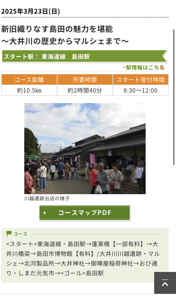 2025/3/23静岡県島田市JR東海さわやかウォーキング新旧織りなす島田の魅力を堪能〜大井川の歴史からマルシェまで〜初めての島田市10.5kmコースで全部見たいよ島田駅をスタート!天気いいけど風がすごい強い最初のスポットが蓬莱橋です大井川にかかる木造の橋です明治12年架橋築128年になるね木造の橋では世界一の長さでギネスにも載ってる長さ897m‼️幅は2.4m欄干は50センチしかないう〜んここまで来たんだし行ってみよう通行料100円払うとおじさんが「風が強いので気をつけてね」数歩進んだだけで風に煽られて体が揺れる〜掴まる場所が無いもう、怖すぎ!歩いたのは50mくらいかなパス!ウォーキングコースに戻ります振り返って見ても...高所恐怖症のひなちゃんやっぱり無理風がなくても諦めます蓬莱橋
