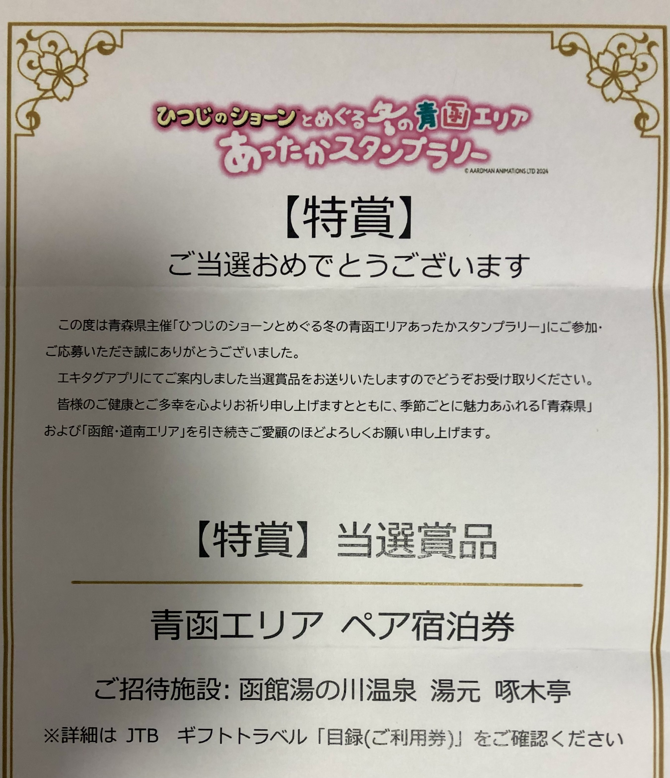 ひつじのショーンとめぐる冬の青函エリアあったかスタンプラリー。なんと、特賞が当たりました。ペア宿泊券です。函館湯の川温泉、湯元啄木亭1泊2食付。JTBの電子クーポン。ネットで、希望日を予約するシステムになってます。使用期限は、9/30まで。平日でも休日でも可ですが、休前日は差額が生じる場合があるとの記載。さあ、いつにするか?きみちゃんも休みを取るつもりで、ワクワク。