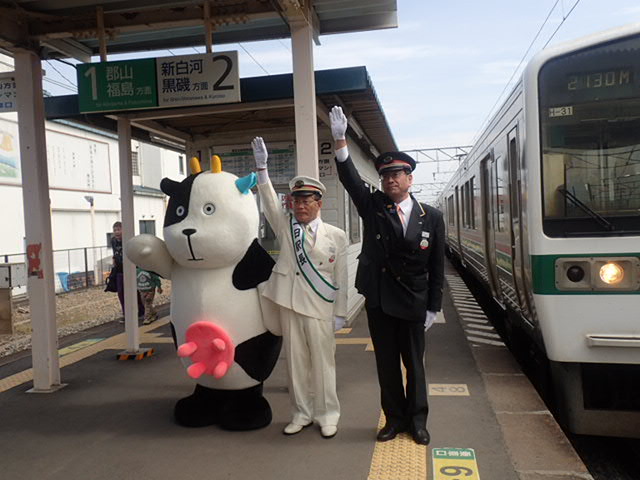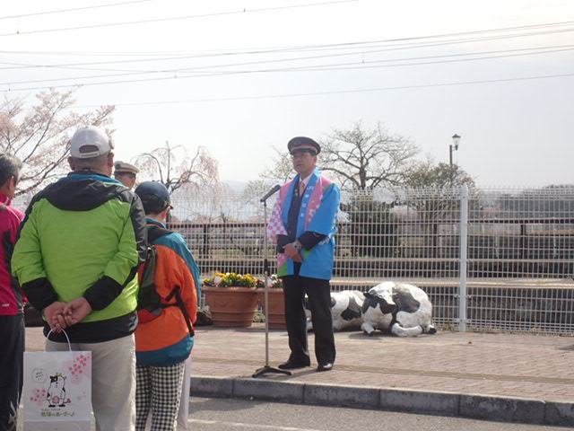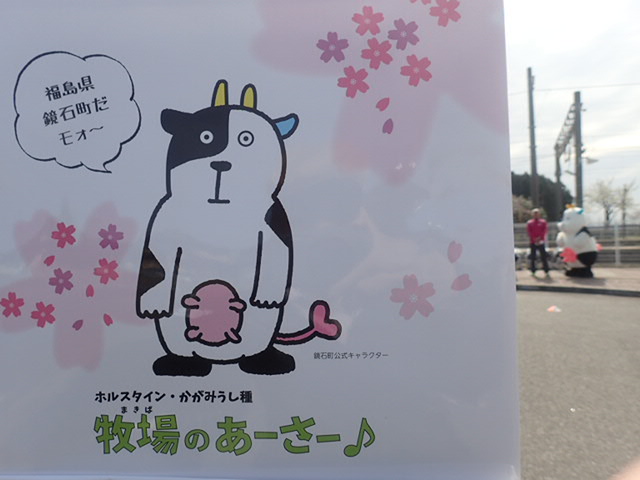 駅長の後ろに、ホルスタイン