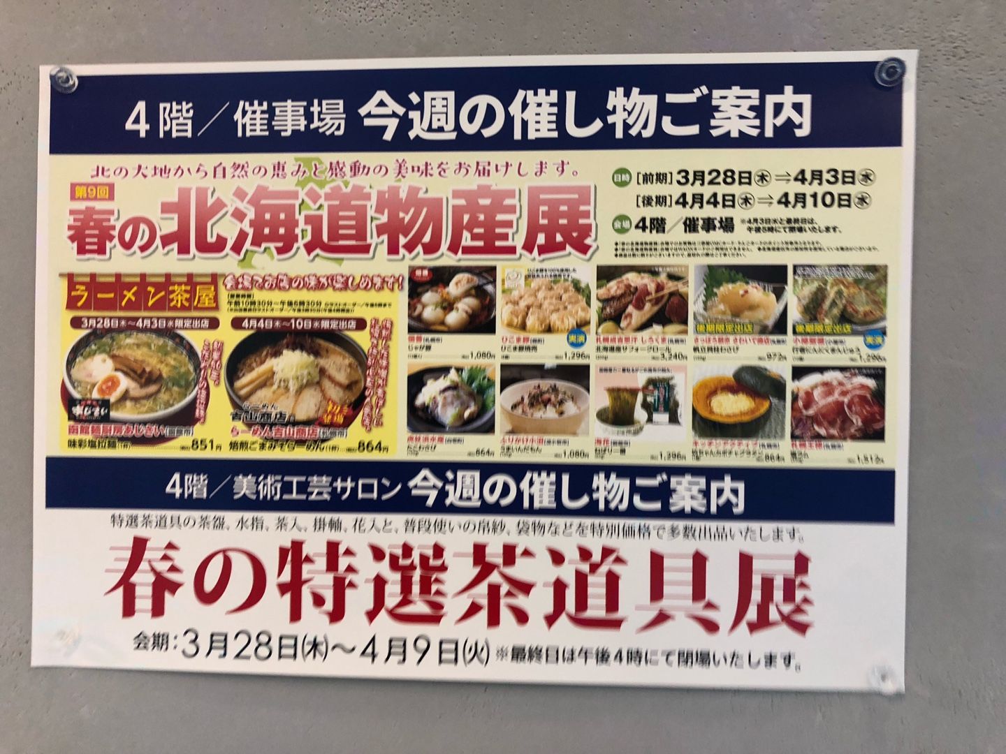 投票の帰り、デパートに寄りました。北海道物産展開催と。18:40頃に行ってみたら、前期と後期の入れ替えみたいで、催事終了していました。チラシでは目新しい商品が、あまりありませんでした。