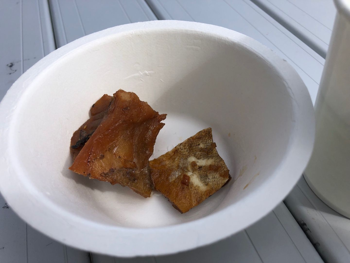 真鱈を天日干しにしたものです。全国で唯一、稚内で作っています。棒たらを戻して煮たものが2切れね。もう一切れくらい欲しいところ。