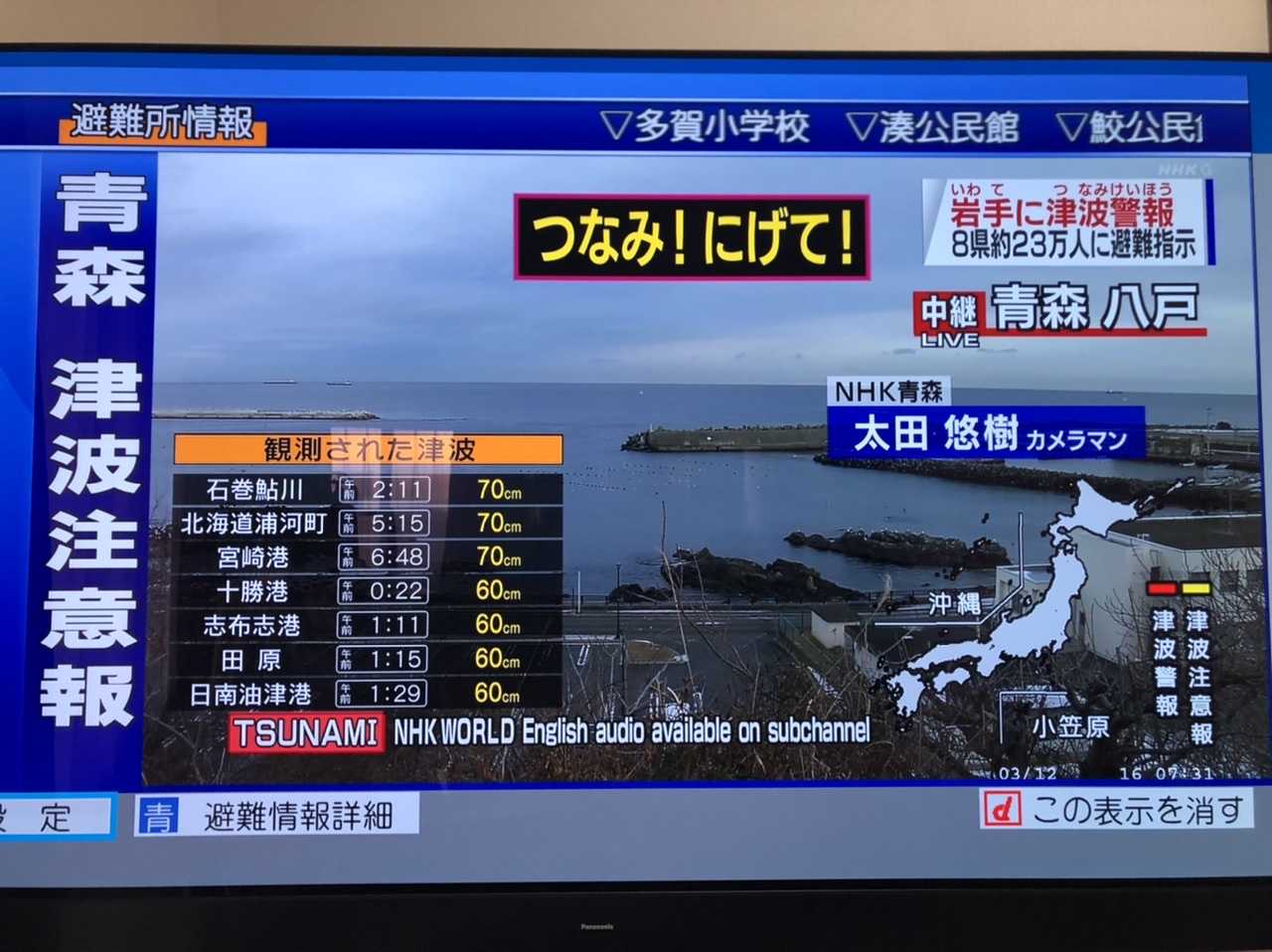 津波警報、注意報が出てます。