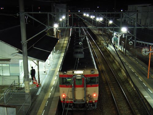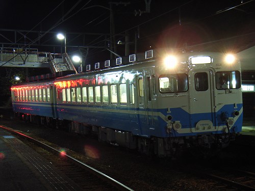今日の186D。いつもの波止浜駅で撮影しました。暗いため分かりにくいですが,先頭のキハ58 216の車体や床下の塗装がきれいになっているように見えます。今日もブレてしまいましたが,どうしても長時間のバルブではブレてしまいます。数日前に撮った1Secくらいならなんとかブレは大丈夫なようですが,今度は高感度ゆえの画質の荒さでそっちの方が付いていきません。このコンパクトカメラ(RICHO CaplioR2)では限界なのかもしれません。F:4.6 4Sec ISO:100 焦点距離:約85mm(フィルムカメラ換算)