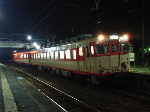 懲りずに今日も186Dを撮りました。国鉄色が最近まともに撮れないため,今日はじっくり(約20分間)撮れる伊予亀岡駅に足を伸ばしました。今回はSpecial版としていつもよりじっくりとご紹介します。まずは65側のいつも押さえているカットから・・・。やっぱり国鉄色は味わい深い雰囲気がむんむんしています。オリジナルの国鉄色塗装をずっと保ってきたわけではありませんが,キハ65では現在唯一の国鉄色です。どこを探しても他にはありません。さらに寄って魅力に迫ります。もっと寄せます。最近凝っているテールランプを強調したカット。油臭さがぷんぷん漂ってきます。今度は先頭の58側へ。お決まりのカットから。ただいつも撮っている波止浜駅とは違い,前の方が暗いため,バルブの露光時間がなかなか合いませんでした。何通りか撮っていたので何とか見れるものがありました。最後は出発シーン。下りの普通単行列車を待って,長い停車時間が終わりようやく出発です。ちょっと暗いです。今回の撮影でバルブ撮影に限ったことで,一つのことがはっきりしました。いつもの波止浜駅では,どうも車体が揺れているためにどうしてもブレてしまうようです。今回の伊予亀岡では,同じような条件であるにもかかわらず,ほとんど失敗がありませんでした。やはり停車時間が短い駅は人の出入りで車体が動いてしまうため難しいのかもしれません。