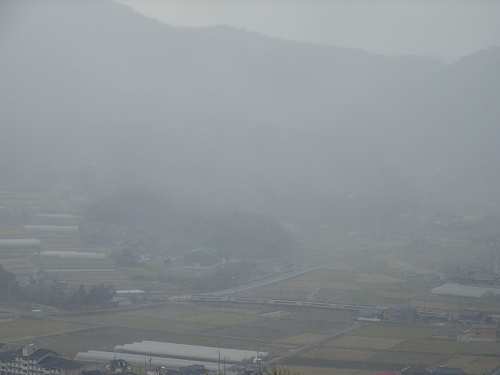 最初は晴れていたにもかかわらず,次第に暗雲が立ち込めてきて,そのうち横風とともに雪が強く降り始めました。風の吹きすさぶ山の頂でしばらく銅像のように立っていたため,手はかじかみデジカメの画面はほとんど見えず悲惨な状態でした。お陰で写真の画面は雪で白っぽくなってしまいました。説明しなければ何が映っているのかも良く分かりません。ちなみに走行中のアンパンマン列車を撮りました。各車両側面の基調色が違うのにほとんど区別もつきません。2000系2007/2/2波止浜-波方
