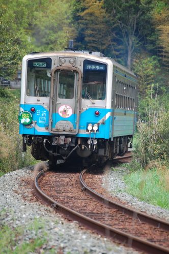 伊予灘付近の山あいの単線非電化区間を長閑に走る気動車。キハ54 92007/4/23高野川-向井原