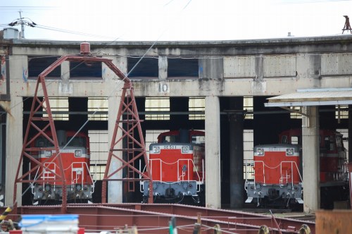 趣きある扇形庫に鎮座するDLたち。いかにも"車両基地"という雰囲気の漂ういい光景です。DD51 1187 & DE50 1 & DE10 1(左より)2009/2/25岡山電車区気動車センター津山派出(敷地外より撮影)焦点距離:188mm(35mm換算),絞り:F5,シャッター:1/30sec,ISO:200