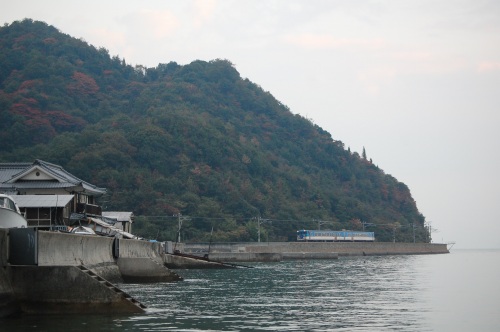 うっそうとした空になり,何となくもの寂しい絵になってしまいました。キハ47 7001 + キハ47 7002(瀬戸内マリンビュー4号)2009/11/9安芸幸崎-忠海焦点距離:約82mm(35mm換算),絞り:F4,シャッター:1/400sec,ISO:800