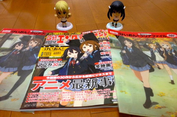11/4発売の日経エンターテイメント。徹底研究『けいおん!』スタッフ・声優が語るブームの秘密もう、それだけでも買うでしょ、買うよねぇ。アニメ最新事情とかも興味あるし。しかもローソン限定でクリアファイル付いて来る!全二種類え、二種類?二つ必要って事?ですよね。まぁ、これまでのけいおん商法では5個が通常だったところが2つって可愛いもんよね。迷うことなく。やばかったよ。1件目のローソンは1冊しかなかったし。会社遅刻してまでもう1件行ったよwwwあまった1冊は遅刻のお詫びに先輩にあげた。